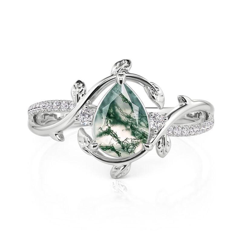 Jeulia Leaf Twist Pear Shaped Moss Agate Engagement Ring