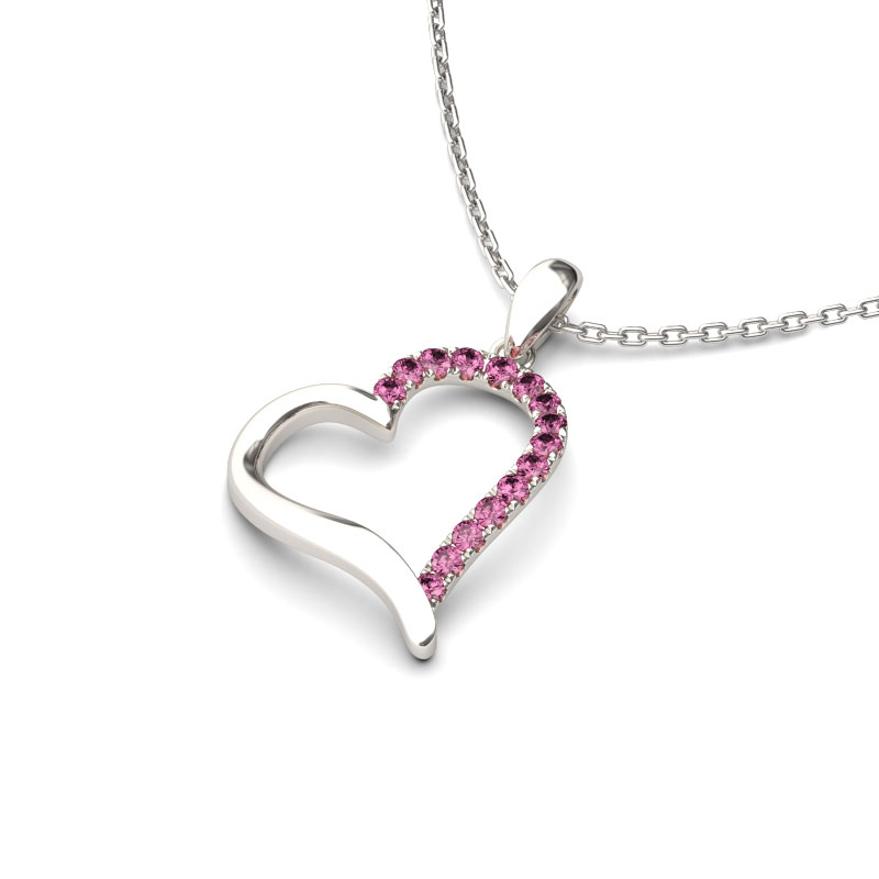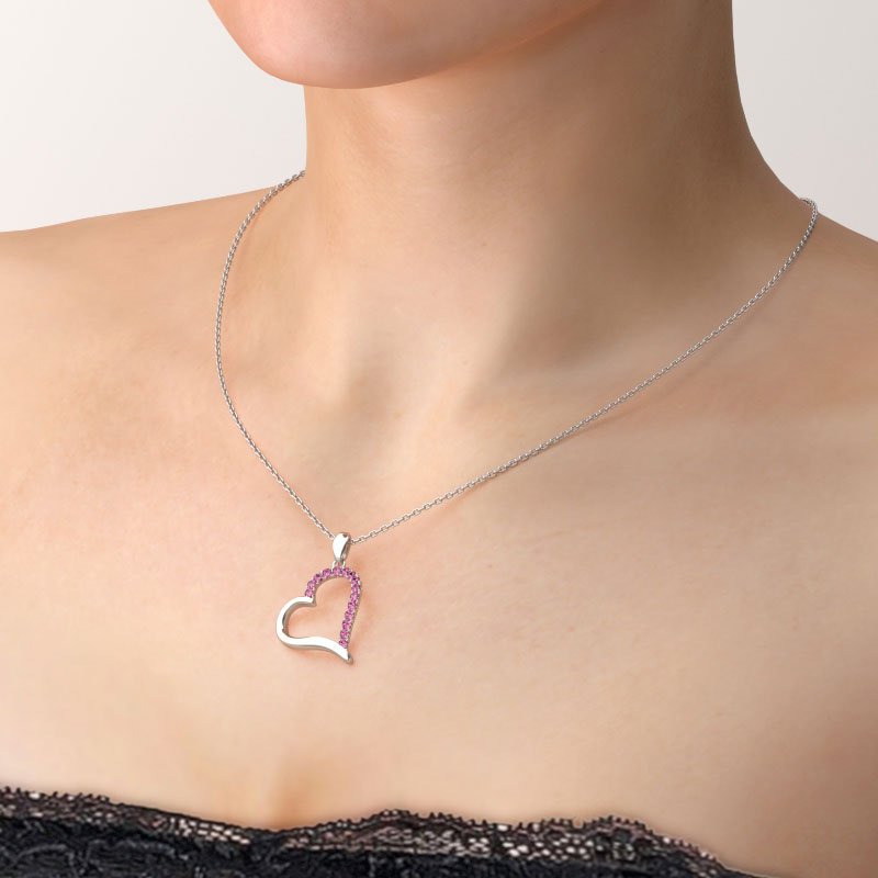 Simple and classic, this heart necklace makes an adorable gift for loved one. Heart is one of the most popular motifs in jewelry. It's always related with love. Crafted in sterling silver, the heart pendant is set with shimmering fancy pink stones. It will certain to show a sparkling and elegant look around your neck. Treat yourself or surprise her with this lovely piece.
