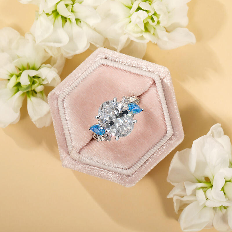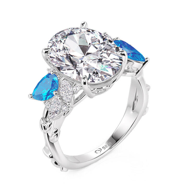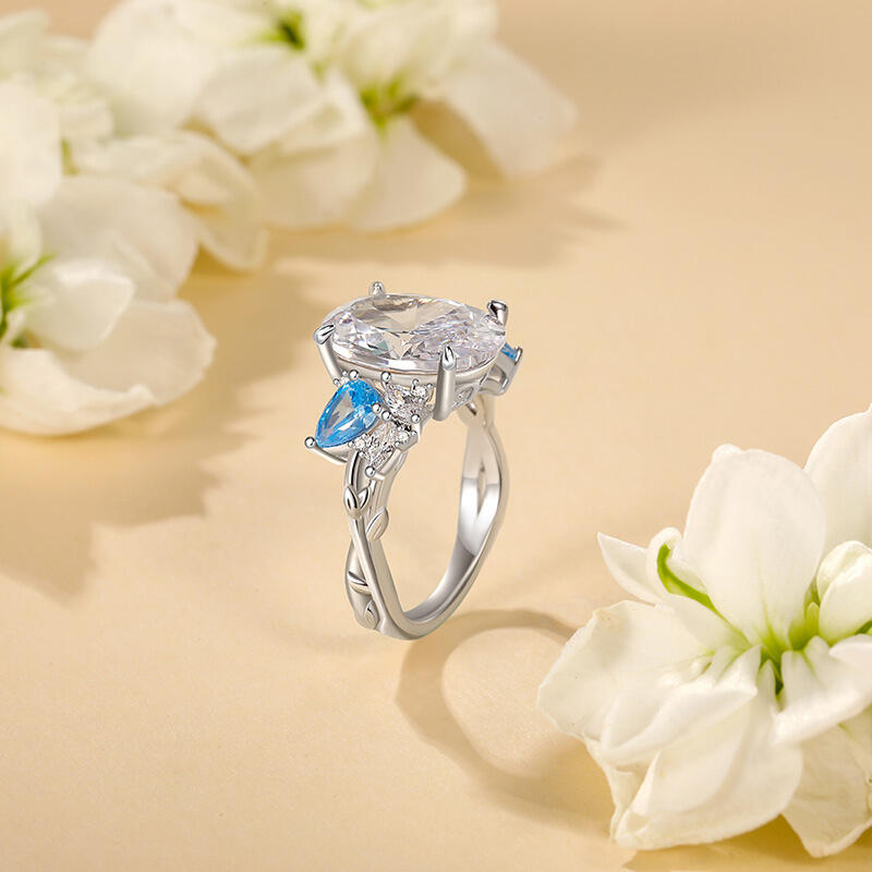 Inspired by nature, this natural leaf oval cut engagement ring with sterling silver crystallizes the dynamic beauty of the forest on your finger. The oval-shaped main stone at the center symbolizes the eternity and purity of love, and its warm cut lines reflect a soft radiance. The main stone is diagonally set with two aquamarine pear-shaped gemstones, which are as clear as morning dew, injecting a touch of natural freshness into the design. The most distinctive feature is the branching leaves that surround the main stone - marquise-cut stones outline the spreading veins of the leaves, while rounded stones are dotted in between, resembling dewdrops of morning light through the leaves.” The “Natural Leaf” engagement ring is a perfect illustration of how love, like everything else in nature, is everlasting. It is a romantic token for a proposal, but also for everyday wear with a natural aesthetic, allowing the poetic light of the forest to shine on your fingertips forever.