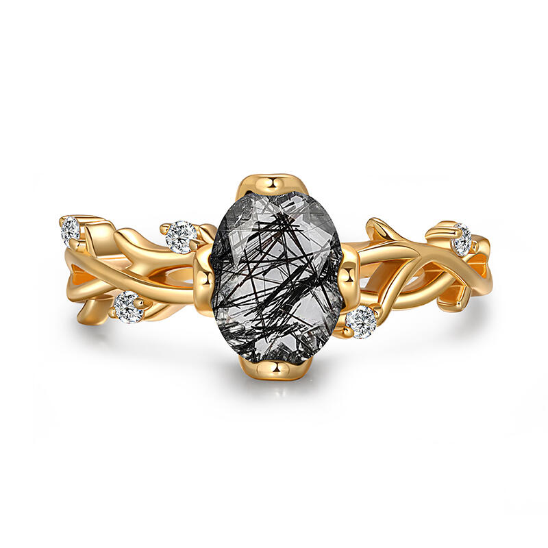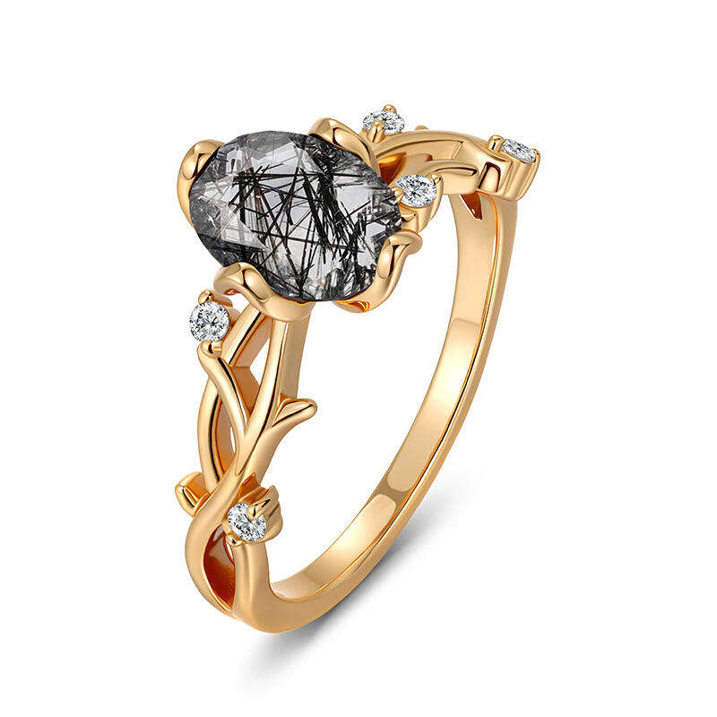 Gold-plated vines coil around an oval black rutilated quartz, their leaves clutching round zircons like morning dew on midnight foliage. The crystal’s golden threads mirror the metal’s glow, blurring the line between earth and artifact. This Jeulia Oval Black Rutilated Quartz Engagement Ring is perfect for those who find elegance in nature’s untamed geometry.