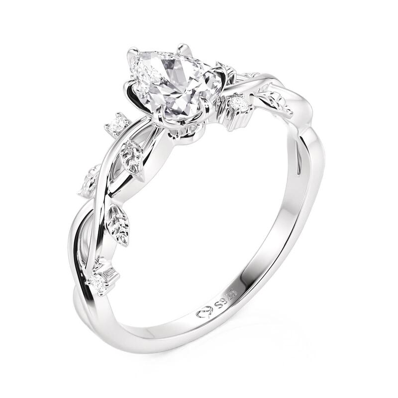 The Jeulia Pear Cut Engagement Ring with Vine Leaf Band beautifully blends nature-inspired elegance with a contemporary design. At its heart lies a stunning pear-cut stone, showcasing a unique, ethereal beauty that captures the essence of romance. The twisting band, crafted from high-quality sterling silver, elegantly resembles intertwining leaves, adding an organic touch that symbolizes growth and new beginnings. Each curve and detail is thoughtfully designed to catch the light, enhancing the overall allure of the piece. This nature inspired engagement ring serves as a perfect symbol of love that is rooted in nature, making it an ideal choice for those who appreciate individuality and the beauty of the natural world. This leaf ring captures both romance and a sense of adventure, celebrating a lifetime of cherished moments together.