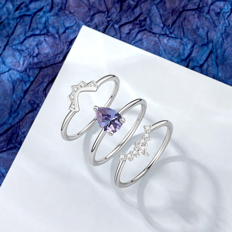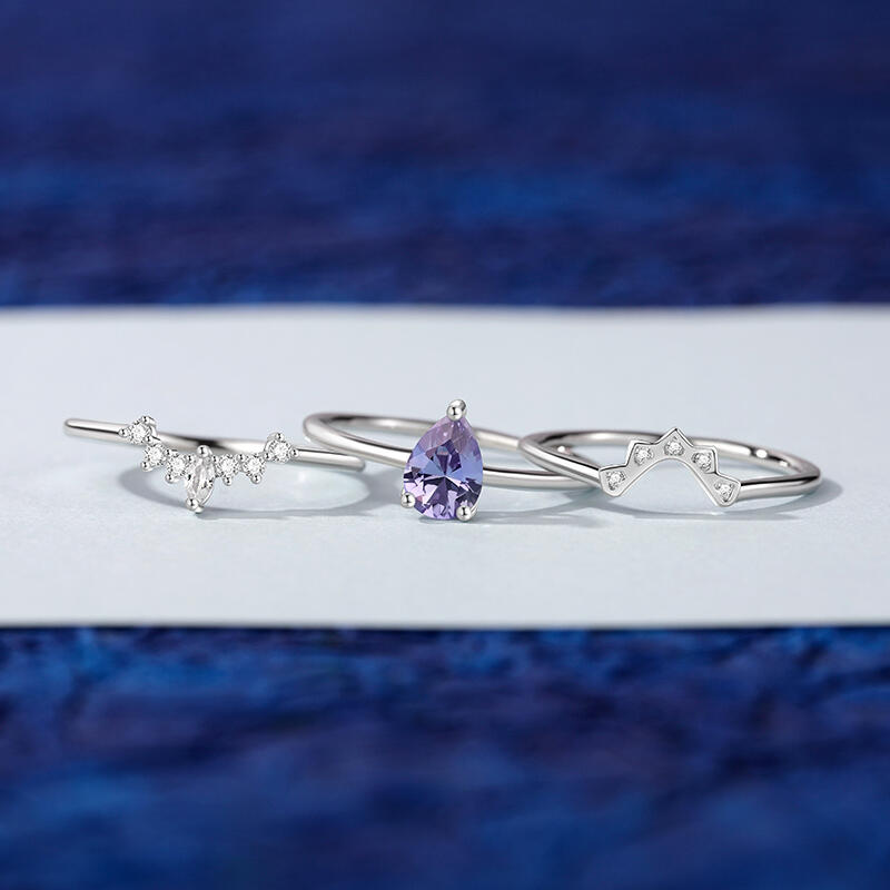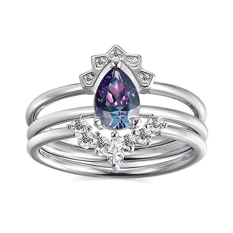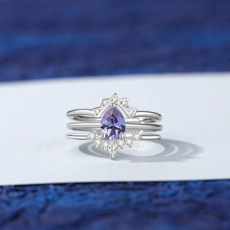 This Alexandrite Pear Shaped Ring Set perfectly illustrates the multifaceted nature of love. The pear-shaped alexandrite on the main ring is like the core of love, colorful and changing with the light. The two matching rings echo each other subtly, symbolizing the promise of togetherness. The three engagement ring set can be worn individually or stacked, and can be worn as an accessory for everyday use or as a statement piece for grand occasions.
