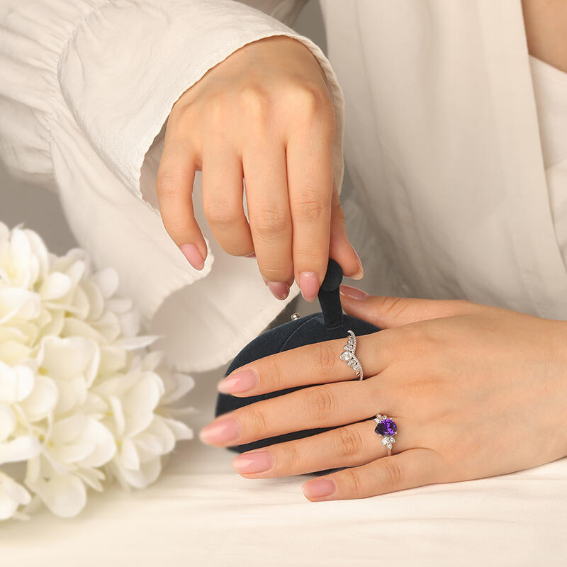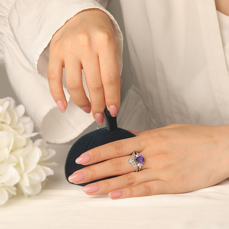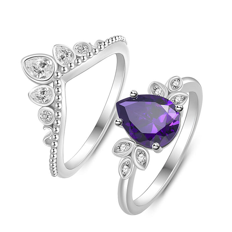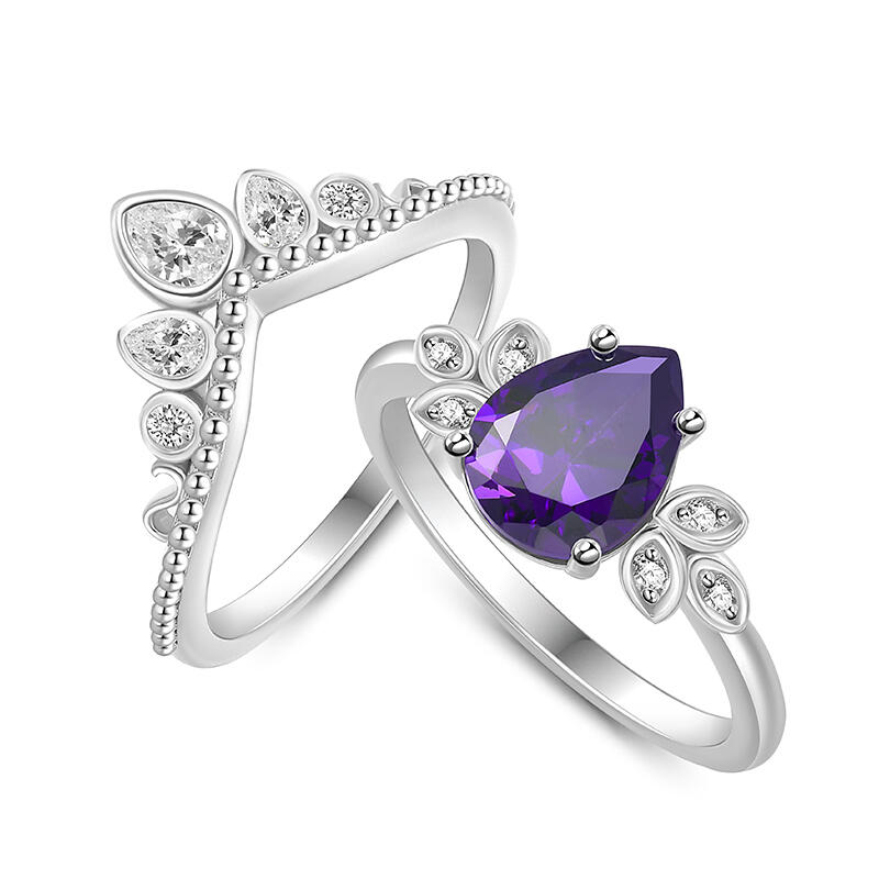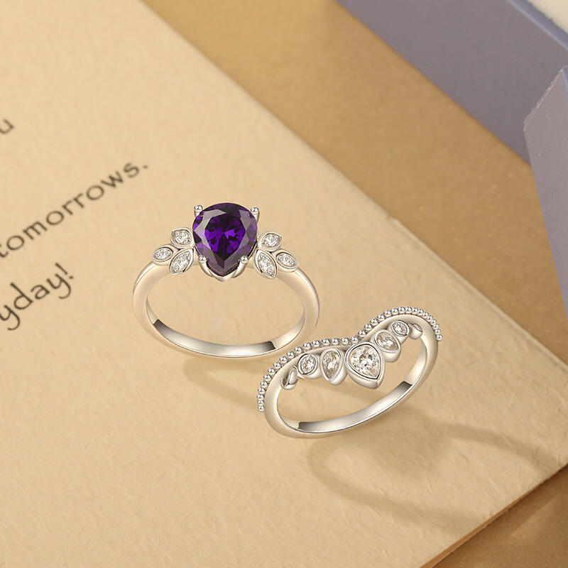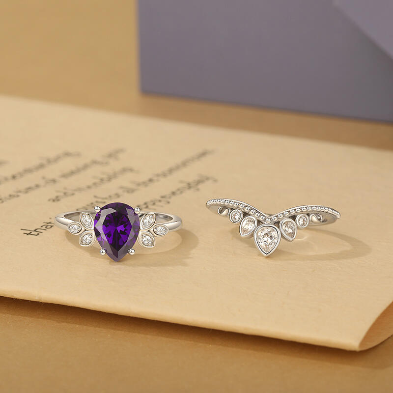 This unique engagement ring set seems to be a princess's crown. The main pear cut stone like a star in midnight, bright and warm. The shape of the clover on both sides means lucky and sweet love. Three pear cut stones on the auxiliary ring are inlaid up the milgrain. Every stone is the care of true love, bright and gentle. They are a sweet promise, carrying the expectations and blessings of happiness of each other. This princess crown ring set is not only a gorgeous decoration, but also a testimony of affection. May it witness the road of happy love, always dazzling.