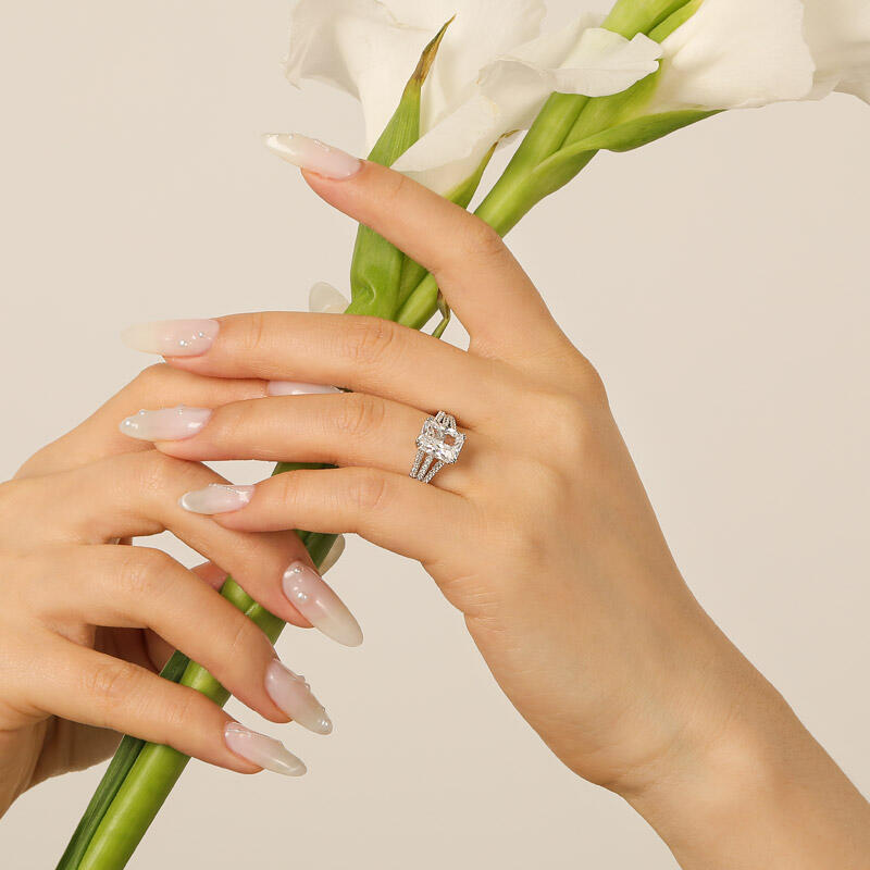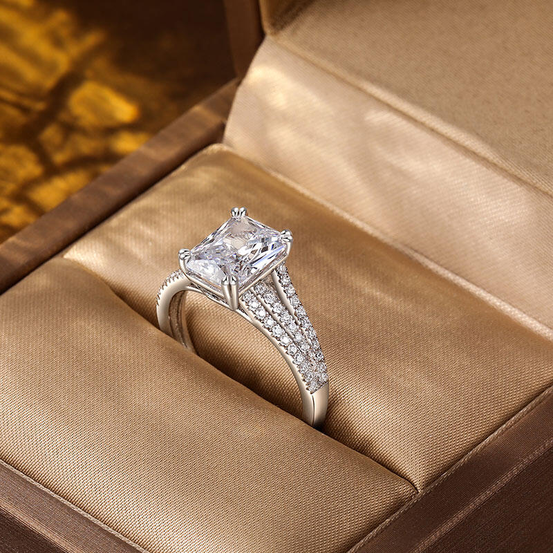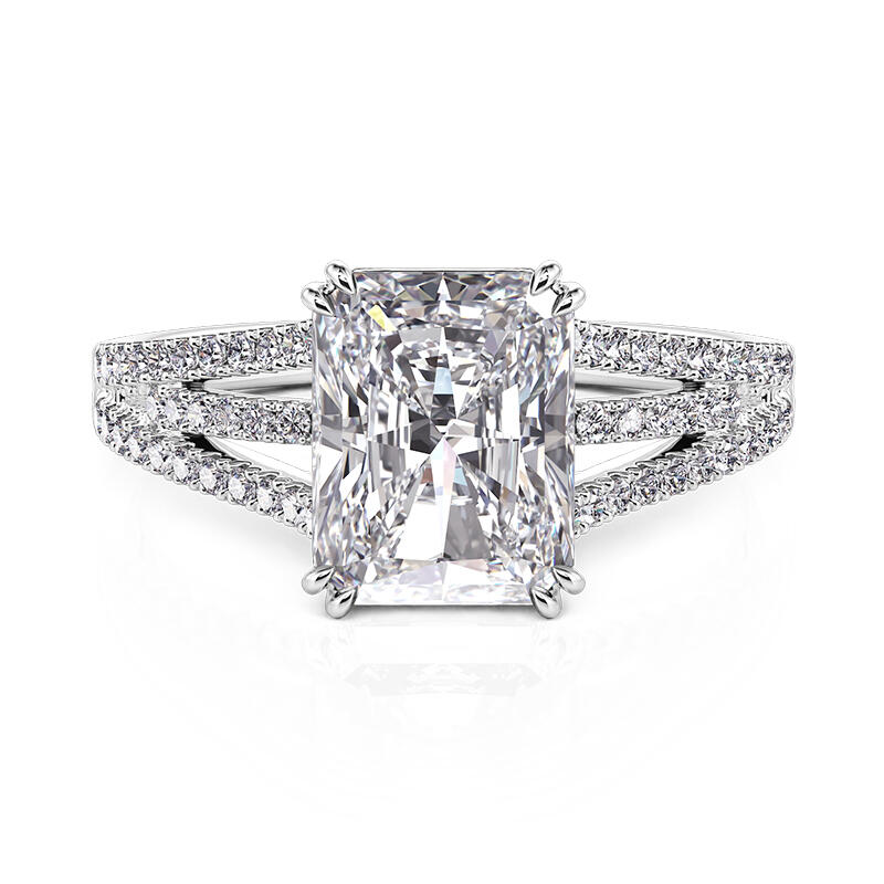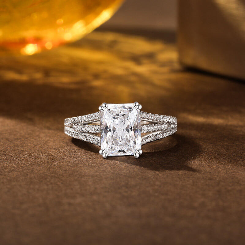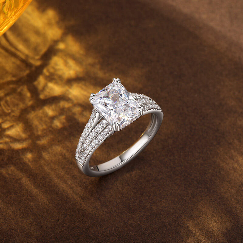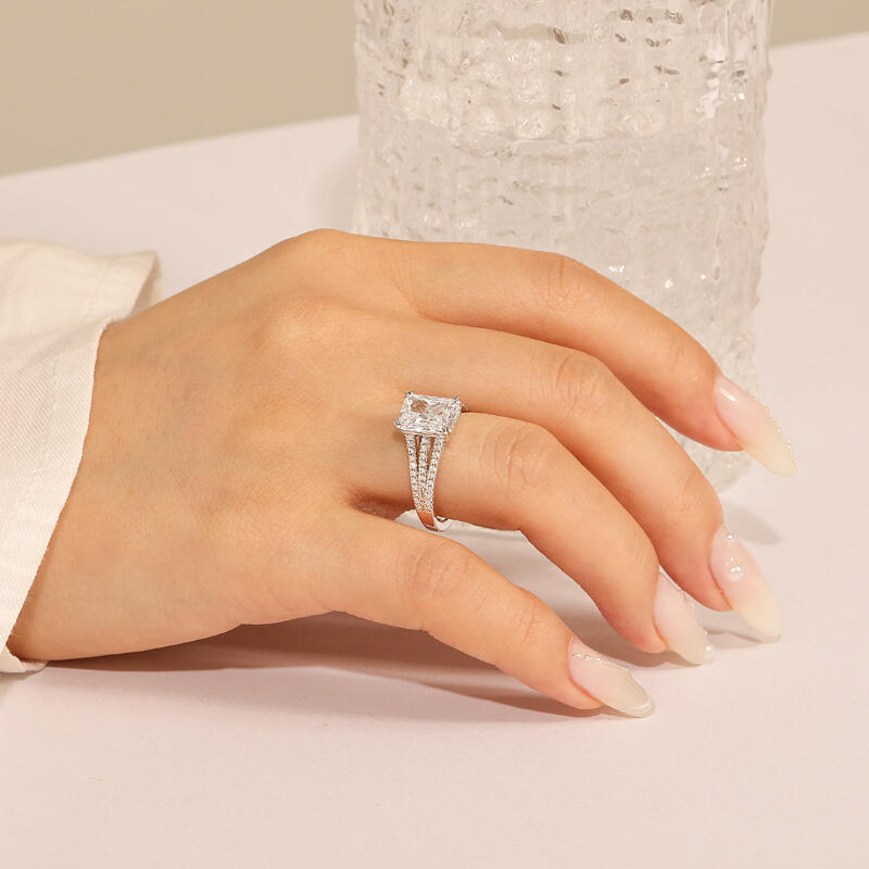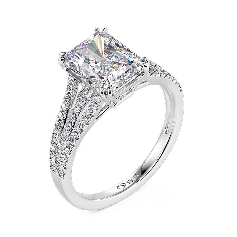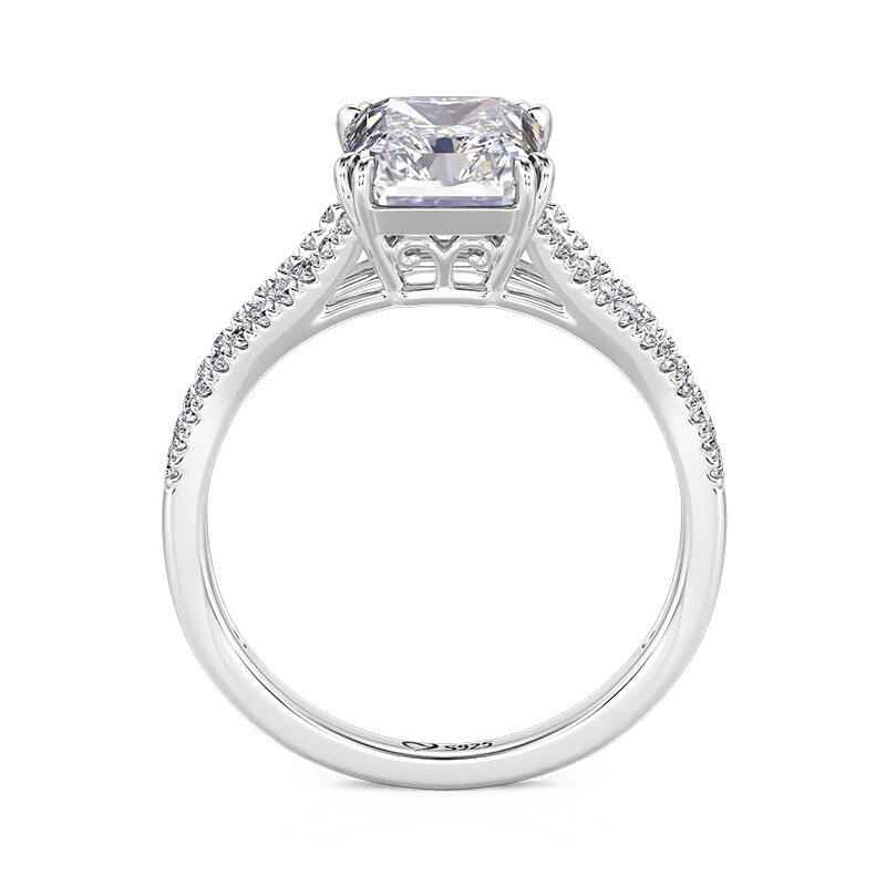 This breathtaking pave setting engagement ring features a stunning radiant-cut center stone, exuding brilliance and sophistication. The elegance is amplified by three gracefully curved, pave-set band shoulders, each meticulously adorned with sparkling stones for a dazzling effect. Crafted from high-quality sterling silver, this radiant cut engagement ring combines durability with timeless beauty, making it a perfect symbol of your commitment. Whether for an engagement, anniversary, or a special milestone, this ring is designed to capture hearts and turn moments into memories.