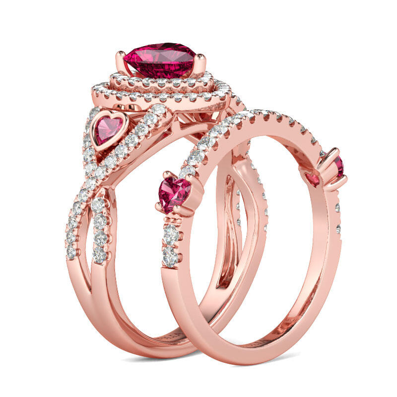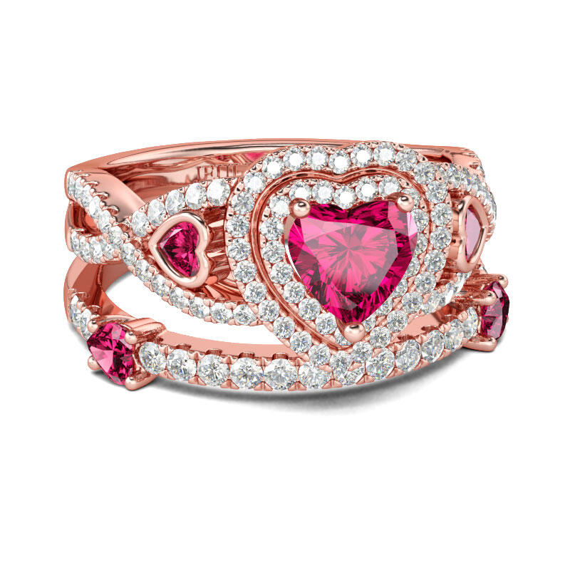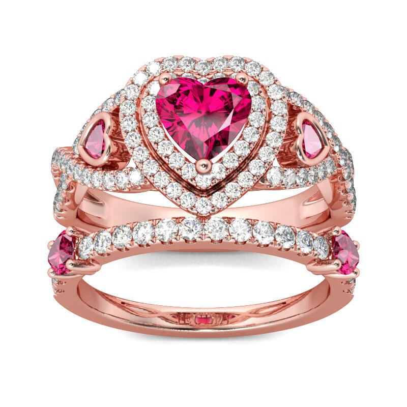 Sparkling and amazing, this ring set will capture your heart at first sight. Crafted in rose gold tone sterling silver, the engagement ring features a fuchsia heart-cut center stone wrapped in a shimmering double halo on a twisting shank. Two heart frames are set on in the shank to complement the design and make the ring look more elegant. With the coordinating band, the ring set will show a sparkling and beautiful look on your finger. Never miss it.