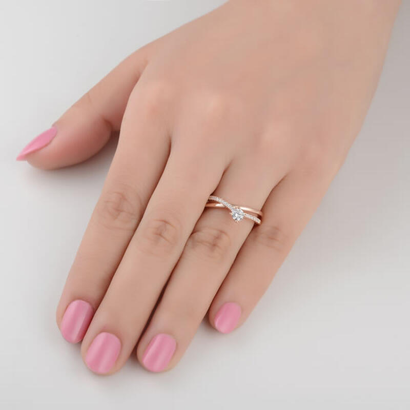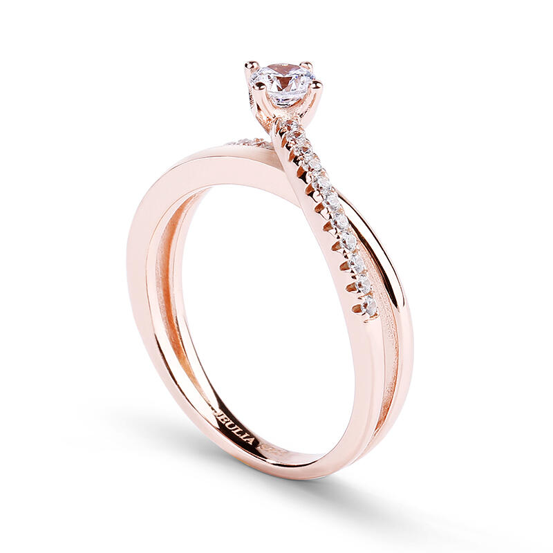 Dainty and delicate, this ring suits her feminine style. Created in rose gold tone, this ring showcases a round-cut stone at the center. Polished and stone-lined ribbons flank the center stone, creating the ring's charming split shank. As lovely as she is, this ring is a look she'll treasure.