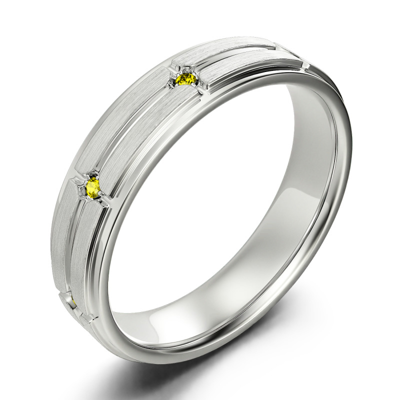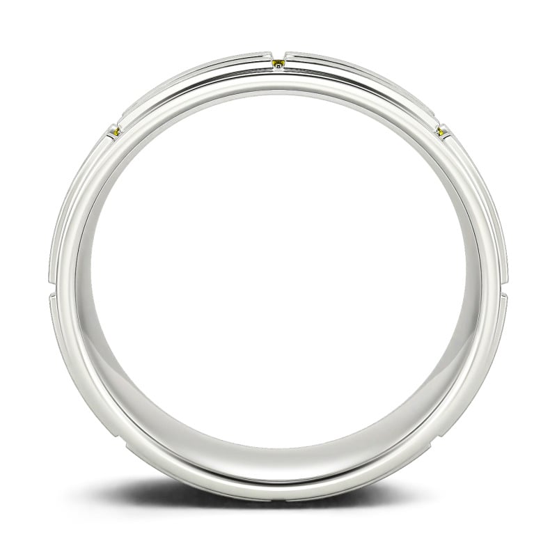 With smart details, this wedding band is a unique look for him. This sophisticated look showcases a grooved grid pattern dotted with shimmering round-cut stones. Stepped edges add further modern detail to the design. Begin your lifetime of love with this handsome wedding band for him.