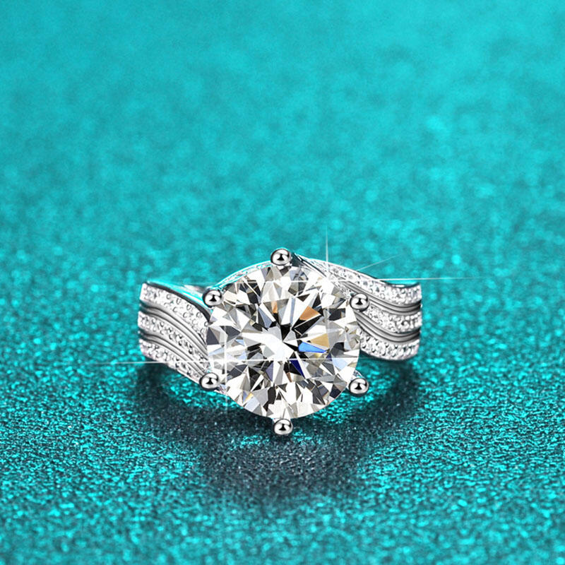 This ring is a stunning testament to the beauty of simplicity. The sleek, circular design of the center stone is expertly cut to showcase its brilliance, capturing light from every angle and sparkling with a captivating radiance. The three delicate lines that grace the shank of the ring add a subtle yet sophisticated touch, creating a sense of movement and depth that is truly captivating.