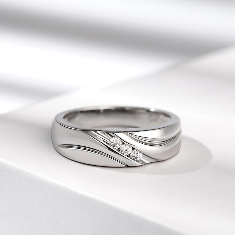 Contoured lines and a trio of moissanite flow along this handsome men's wedding band. This piece is highlighted by a diagonal stripe of three round stones adding a touch of eye-catching style. The perfectly polished finish, together with the striking shine of channel-set stones, is definitely a fashionable choice for him.