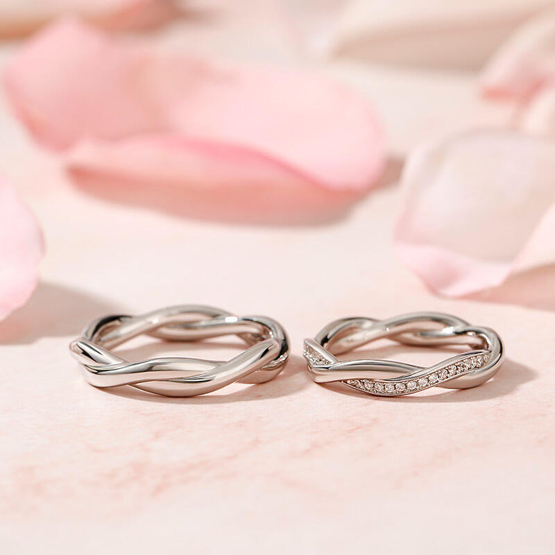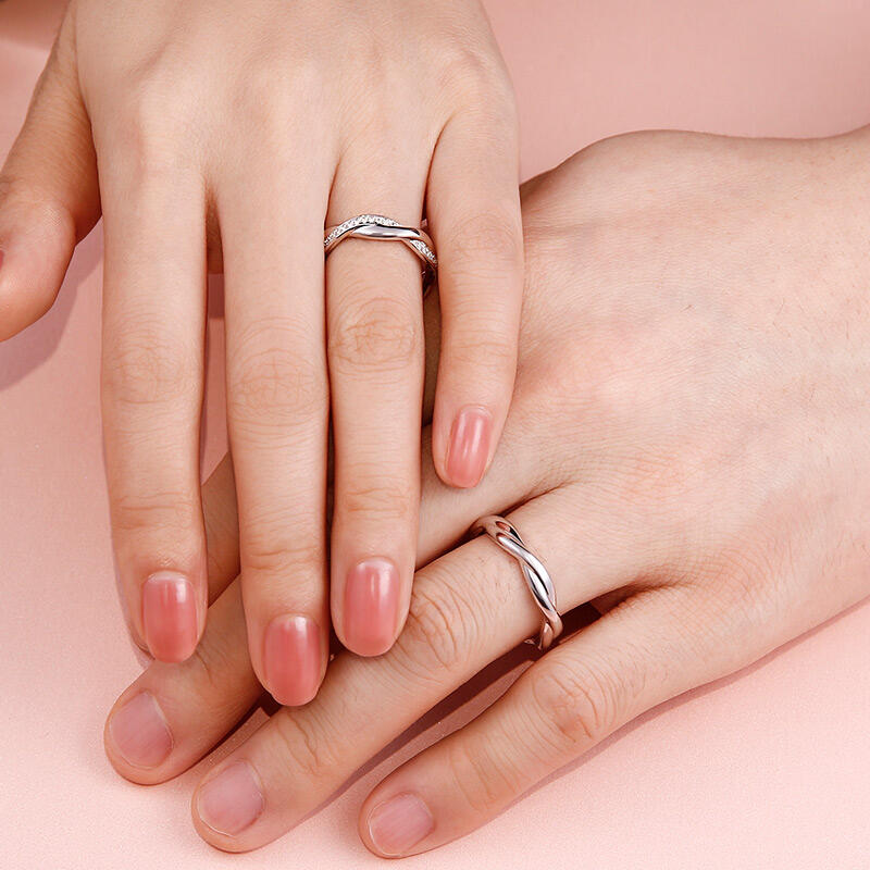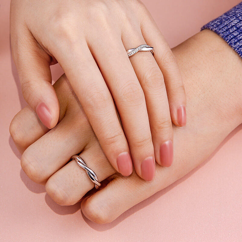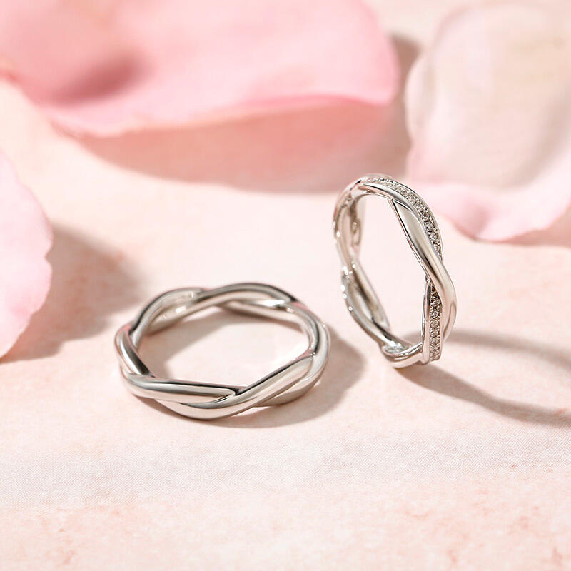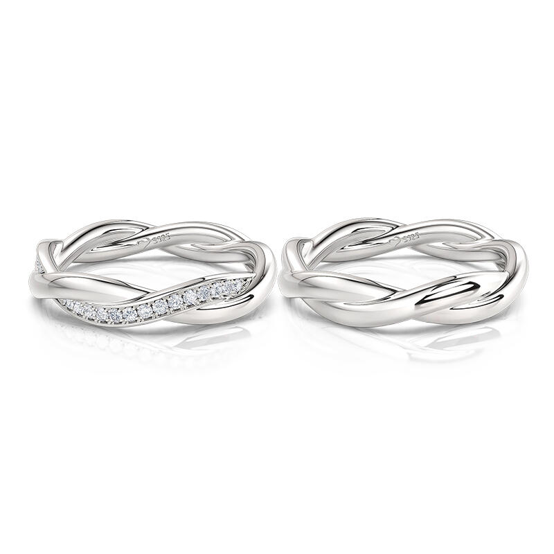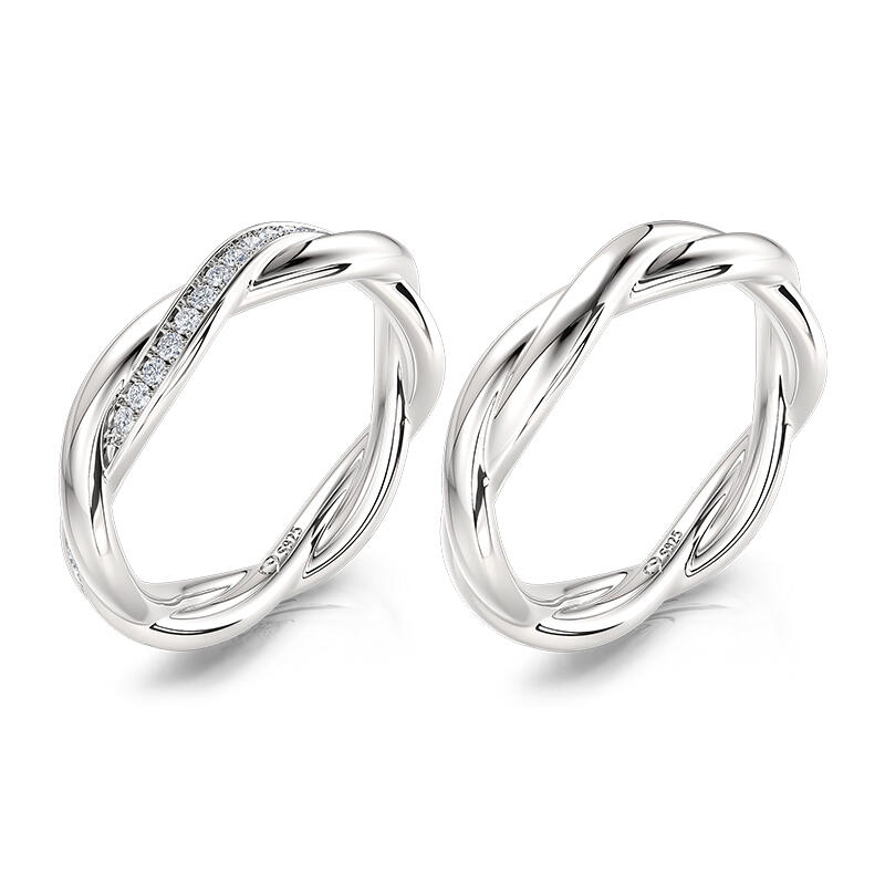 A simple custom couple ring set with twist design for those who love the simplicity and elegance of design. The men's ring features a classic twisted design that emphasizes the man's sophistication and stability. The women's ring adds a string of stones to the twisted design, symbolizing that the wife is the most precious being in her husband's life. This pair of couple rings has a profound meaning and a clever design that expresses the love and commitment of the newlyweds to each other. They are not only a pair of sparkling accessories, but also an unbreakable bond between two people who share a common dream and future.