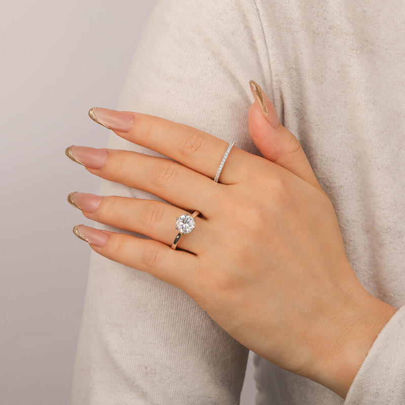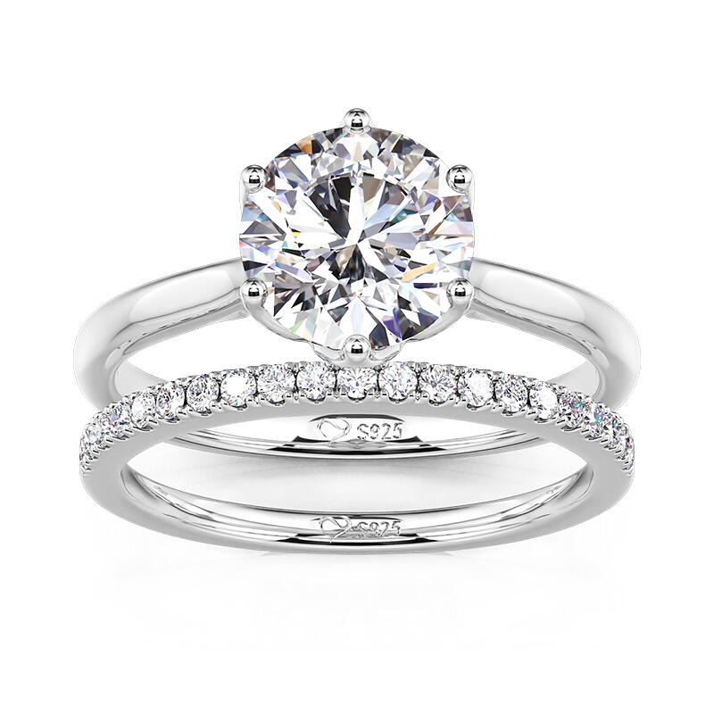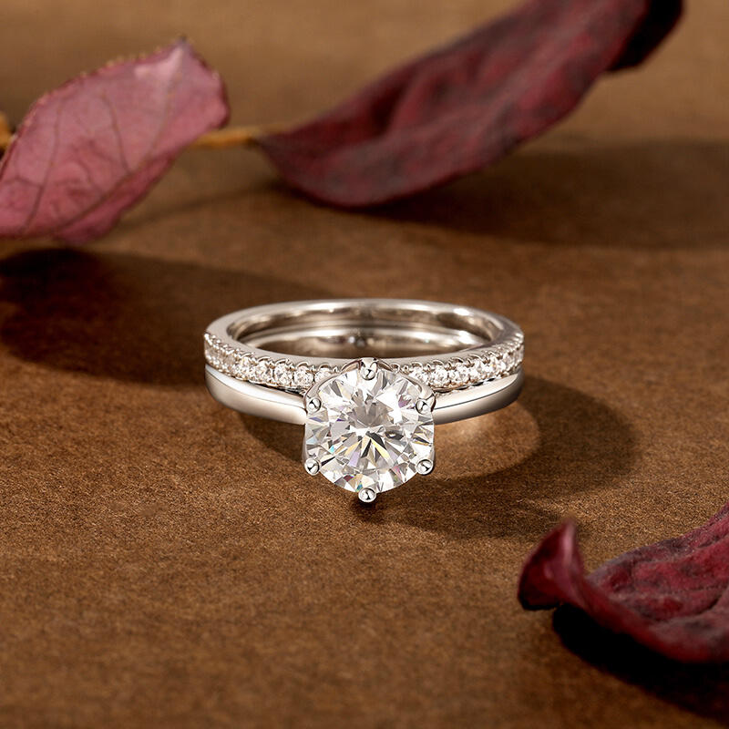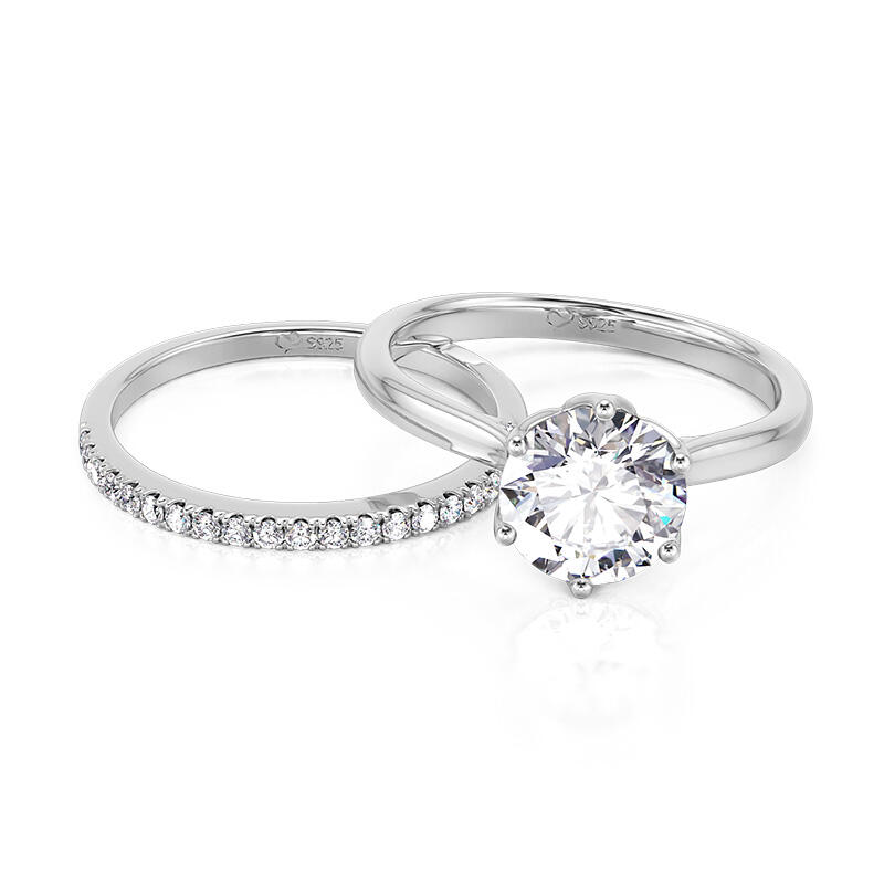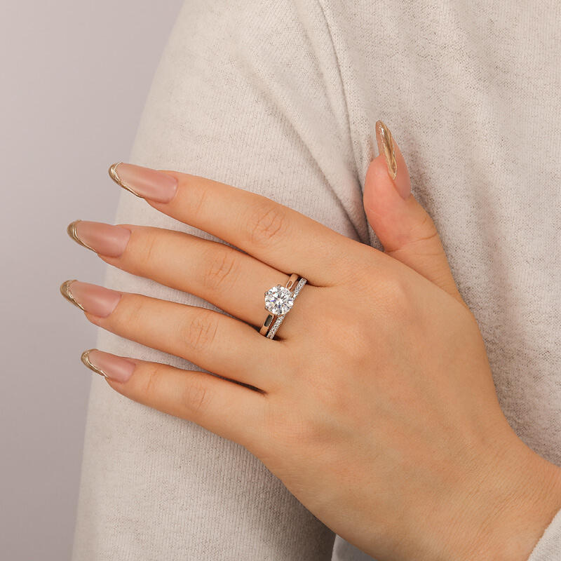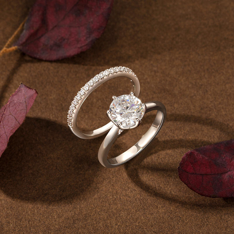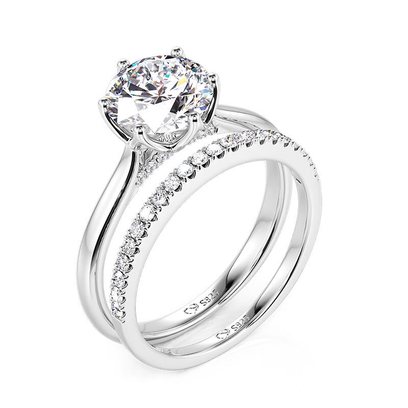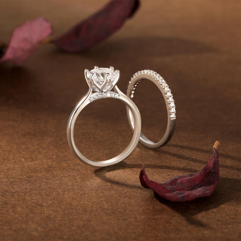This simple flower engagement ring set is inspired by the elegance and beauty of flowers. The large round diamond at the center of the main ring resembles a blossoming bud, and the luster of the carefully cut diamonds reflects the glamour of the blossom. The floral shaped band resembles the petals of a flower lightly clustered around the center of the ring, accentuating the main diamond. The half circle pave arm is like a delicate vine of flowers, further embellishing the romantic feeling. The entire engagement ring design skillfully integrates the elements of nature, creating a visual effect that is both life-giving and poetic. Whether it is the shape of the flower or the main diamonds, all of them reveal the unique craftsmanship and delicate design skills.