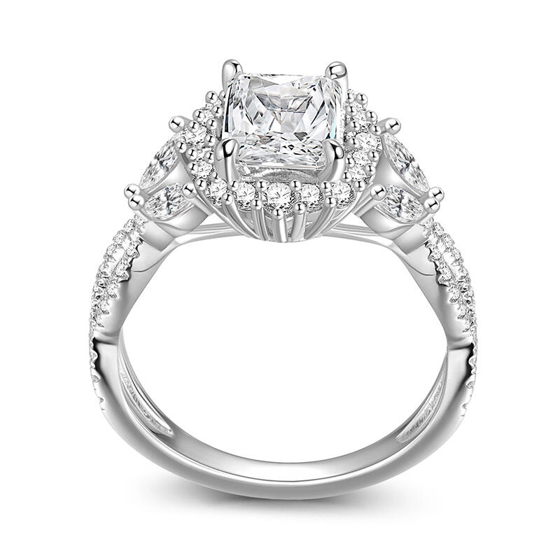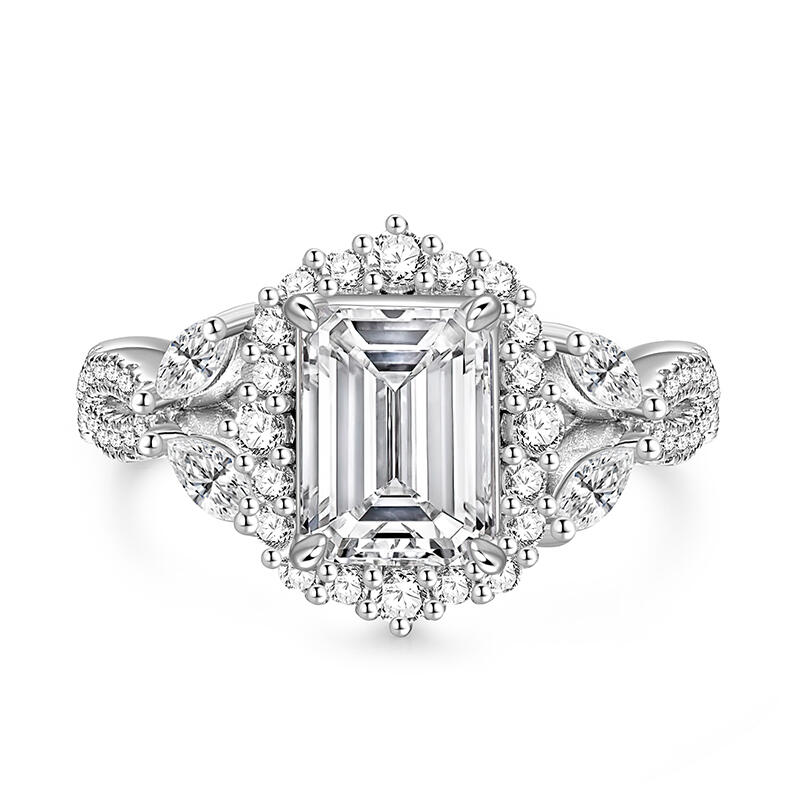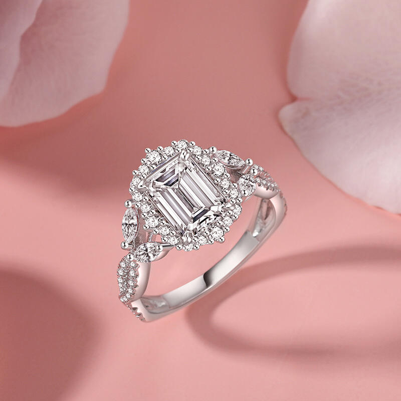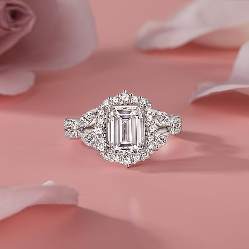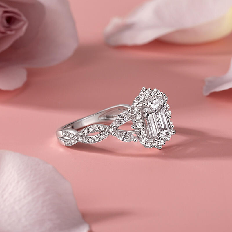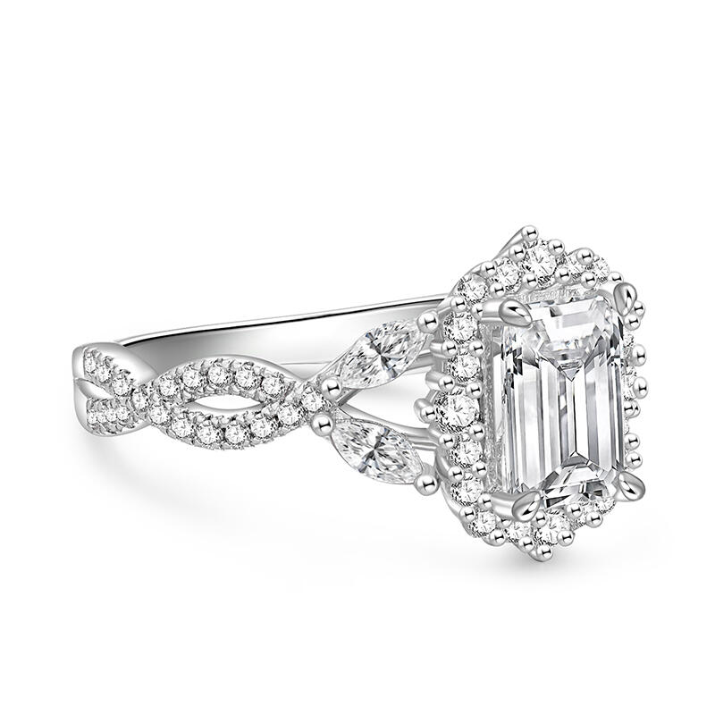 This simple twist halo emerald cut wedding ring is a perfect combination of traditional and modern design, with a large Halo-style main stone that adds elegance and sparkle to the overall look, showcasing a gorgeous aura. The unique twist arm gives the whole ring more layers and movement, just like the endless cycle of love. This simple halo wedding ring not only symbolizes your eternal commitment to each other, but also the uniqueness of cherishing and pampering each other. Whether it's for a wedding ceremony or for everyday wear, it will be a dazzling addition to your love journey.
