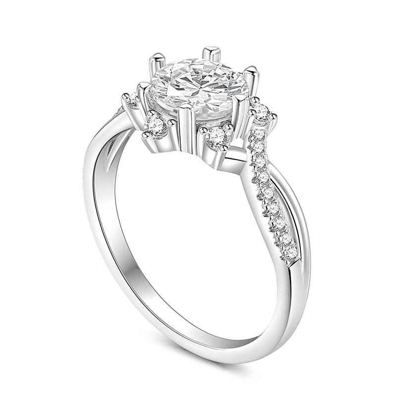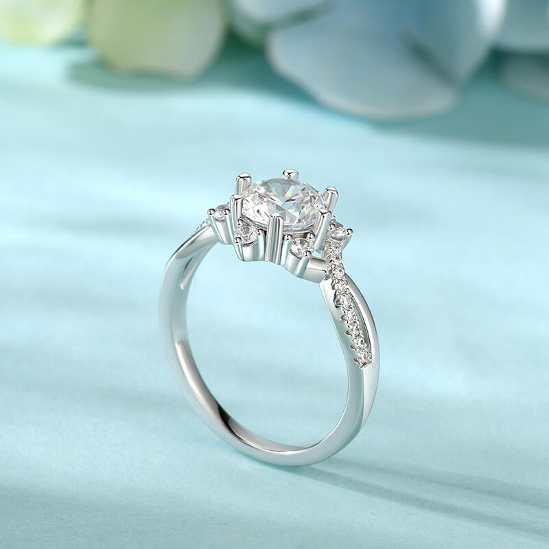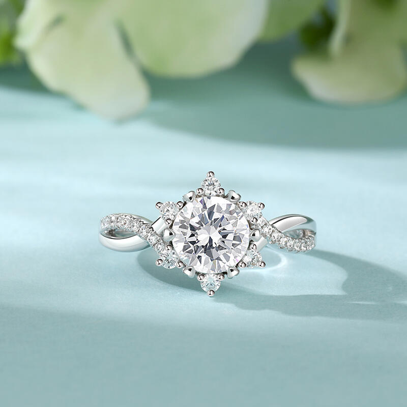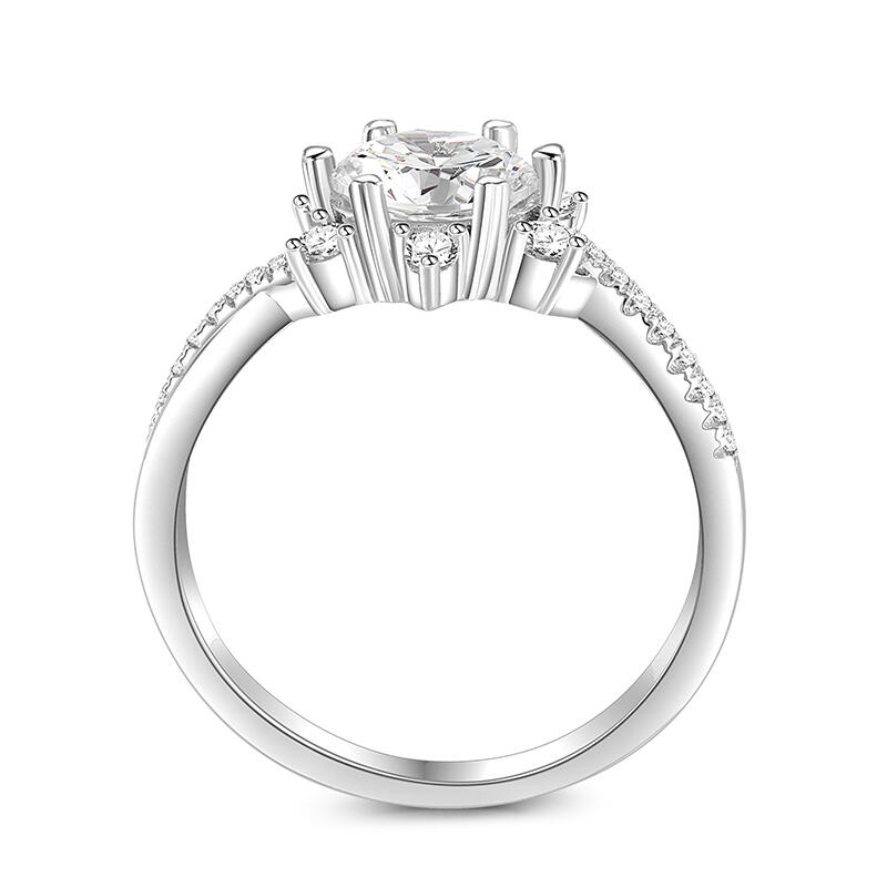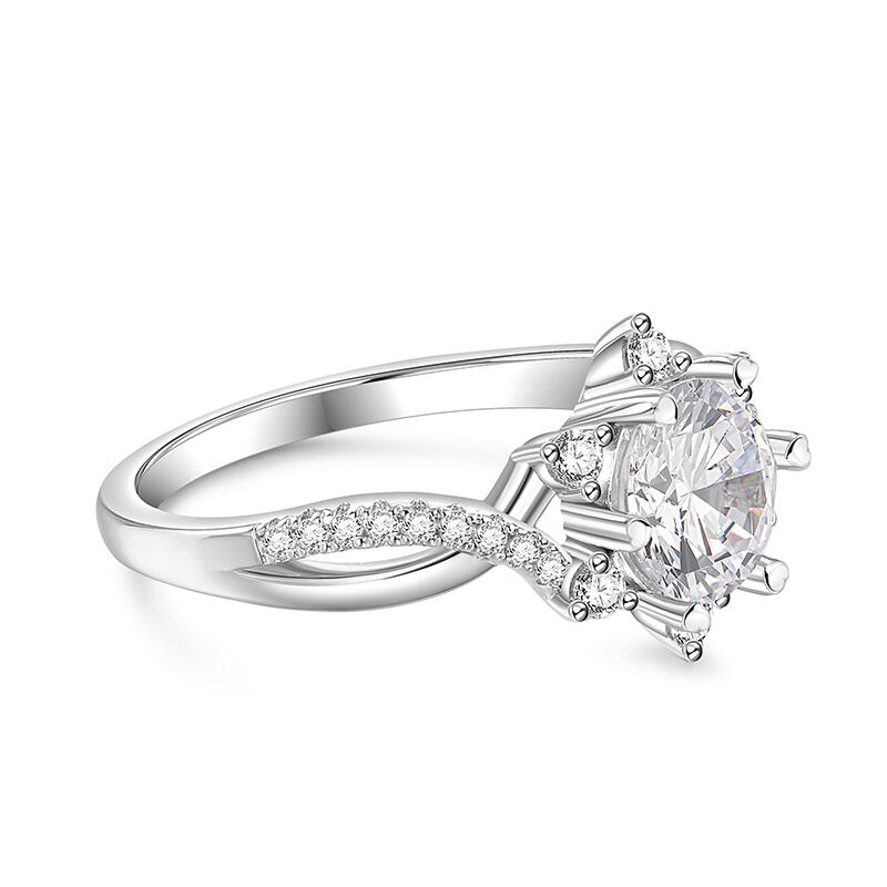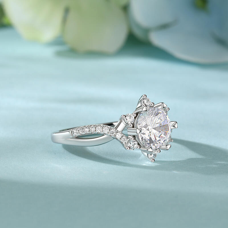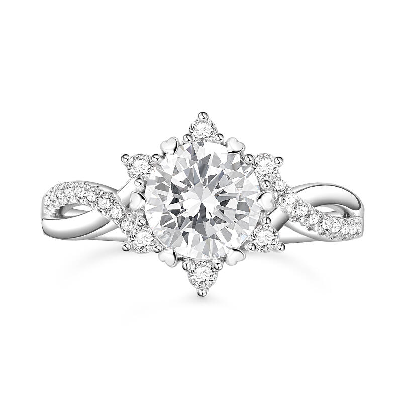 This snowflake engagement ring captures the beauty and intricacy of a snowflake gently falling from the sky during a winter snow. Its exquisite heart prong design details make the ring more lively. The clever twist design makes it sparkle on your finger. The bright light will attract people's attention. Give it to a special person on a special day to remind her of the special moments of the year.