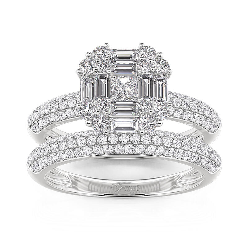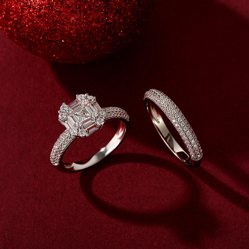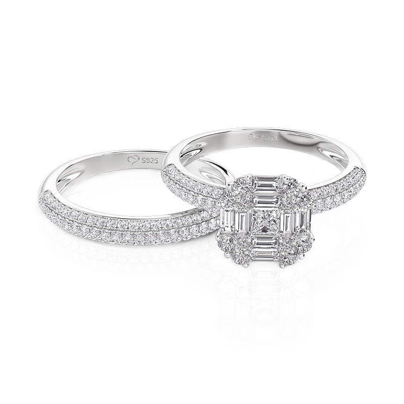 This Jeulia 2pcs Eternity Ring Set features a symphony of geometric gems. The main band layers rectangular and round zircons in a starburst pattern, while pavé stones orbit the shank like delicate planetary rings.. The companion band mirrors this cosmos with a fully pavé shank, its micro-zircons scattering light like distant galaxies. For nights that demand constellations at your fingertips.