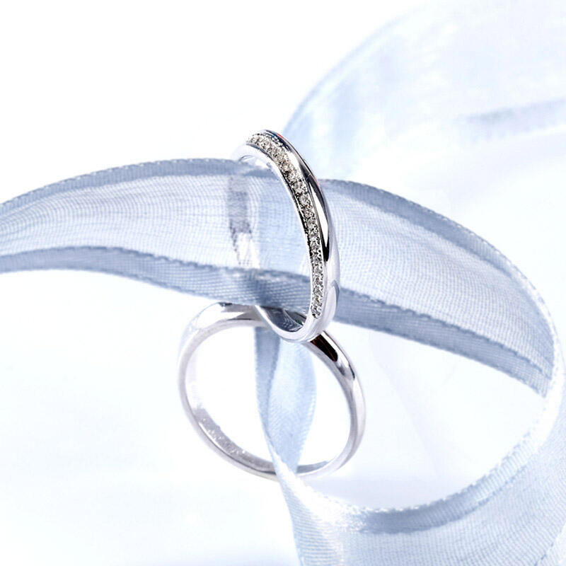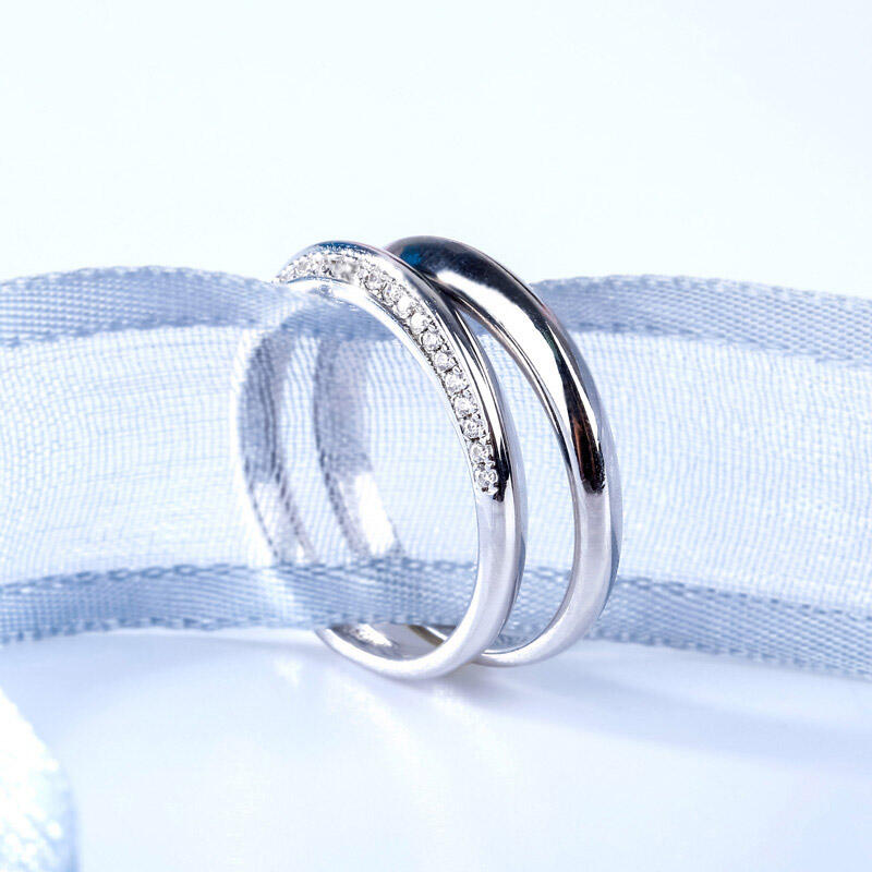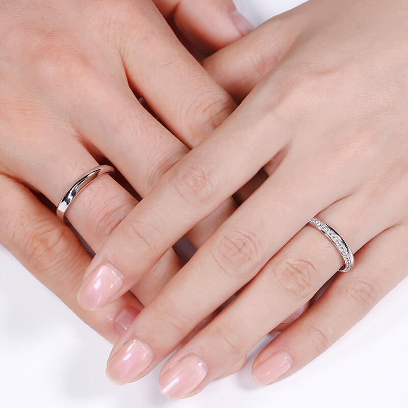 These captivating couple rings represent a lifetime of love. Created in sterling silver, this band set features a classic styling men's band and a women's band adorned with round stones that complements any taste and style. Simple in design, both rings are finished with a bright polished shine. Celebrate your commitment with this meaningful wedding band.