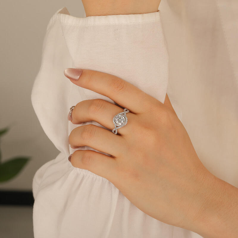 The Jeulia swirl engagement ring features liquid-like silver coils swirling around a frosted zirconia center, with the band twisting like a ribbon caught in a gentle breeze.. Micro-set white zircons trace the swirl’s path, their sparkle soft as dewdrops on morning grass. No gaudy excess—just organic motion frozen in sterling silver, for hands that prefer subtle poetry over shouts.