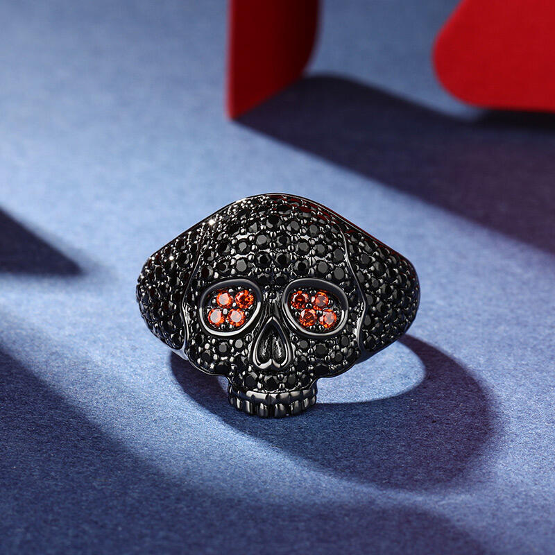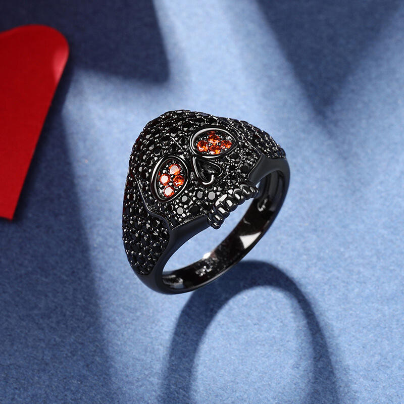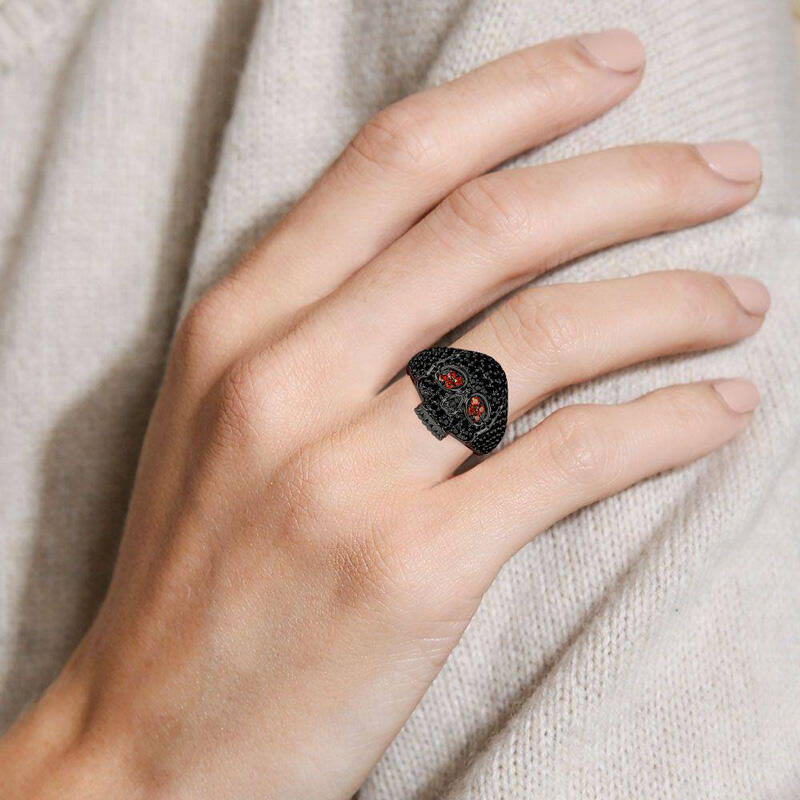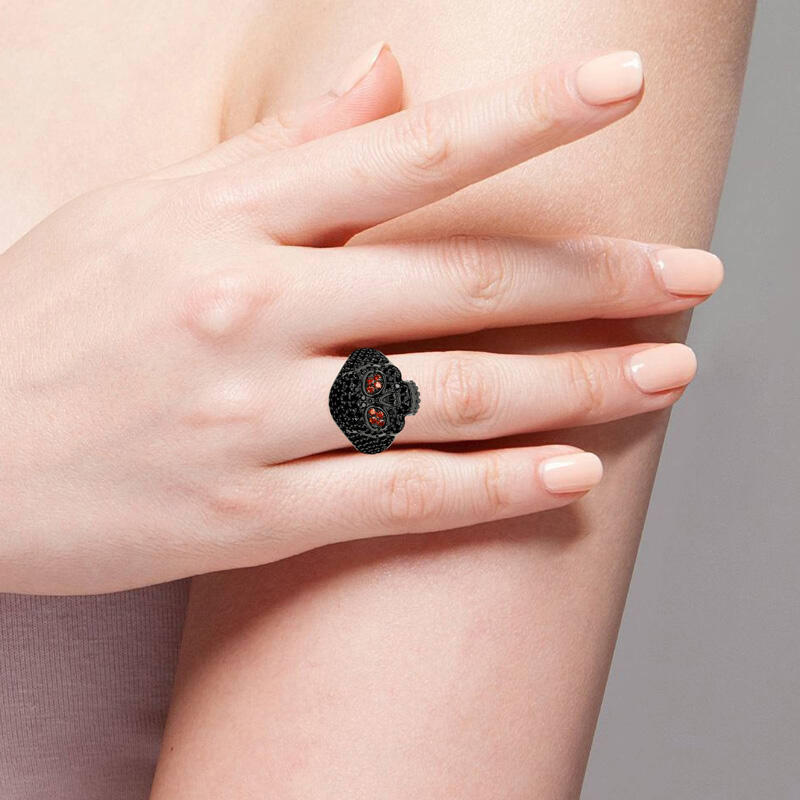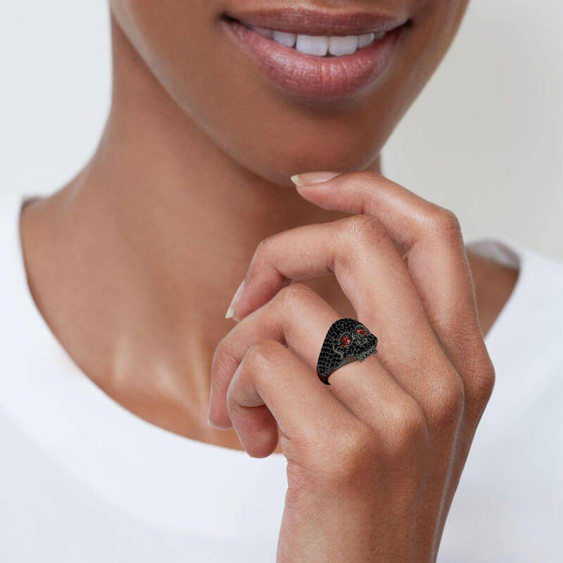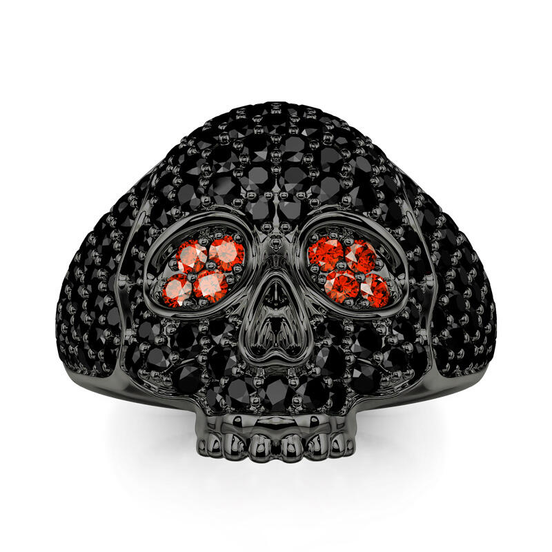 Stunning and sparkling, this skull ring will capture your heart at first sight. The skull is one of the most attractive and fashionable motifs. Luxuriously sparkling, this sterling silver ring features an exquisitely handcrafted skull paved with shining stones. Stare into the glaring red eyes and find yourself hypnotized. Treat yourself or surprise her with this masterpiece this holiday.