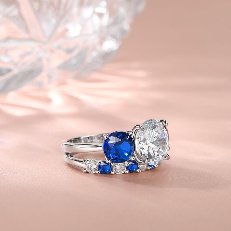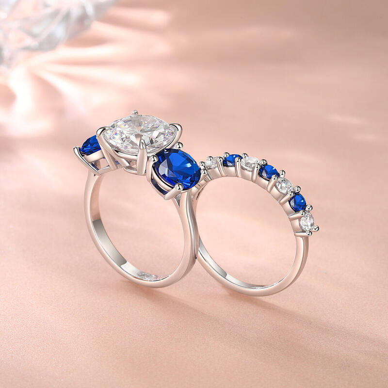 Jeulia Three Stone Engagement Ring Set Blue and White Interval Sterling Silver