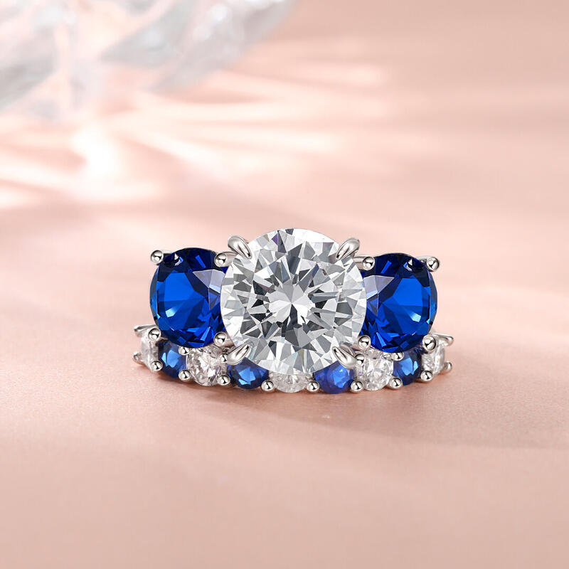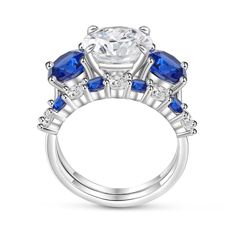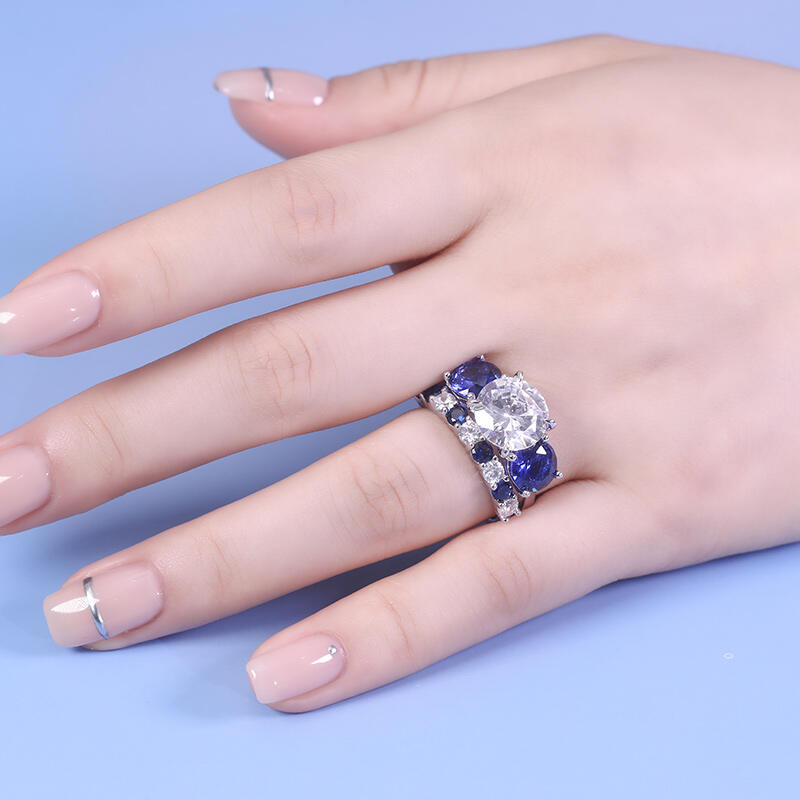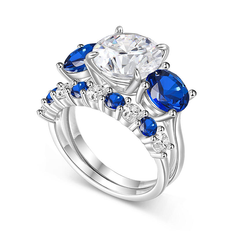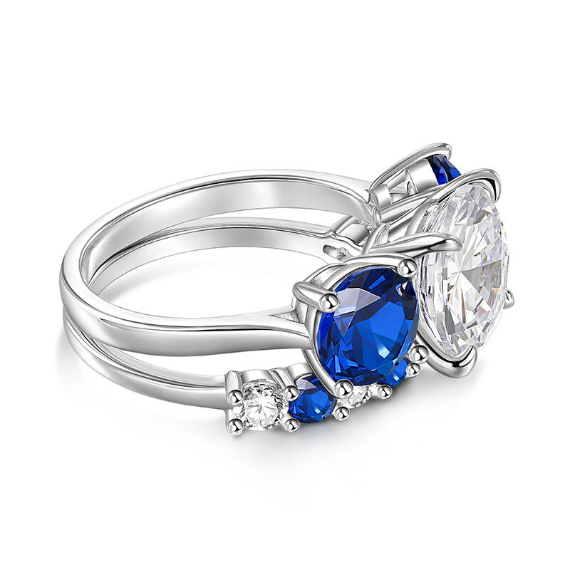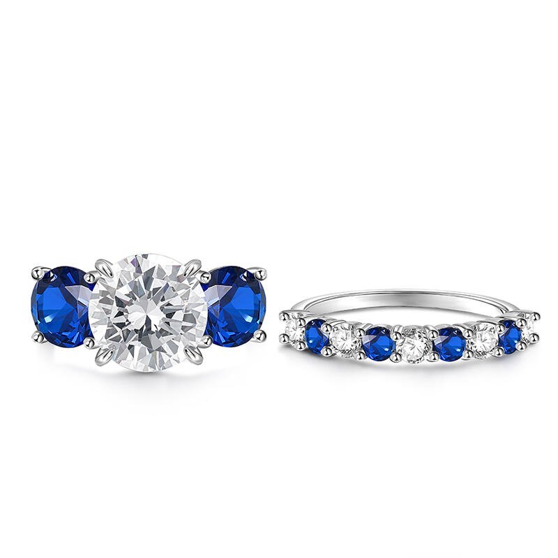 This exquisite three stone engagement ring set, crafted in gleaming sterling silver, is a timeless symbol of love and commitment. The centerpiece of this stunning design is a captivating white stone, surrounded by two dazzling blue stoness. A beautiful white-blue pattern is soothing and relaxing. Whether you're proposing to the love of your life or simply looking for a beautiful piece of jewelry to add to your collection, this engagement ring set is sure to exceed your expectations.