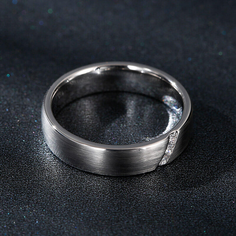 He'll appreciate the sleek design of this moissanite wedding band. A striking diagonal line of stones creates a unique, eye-catching design in this matte-brushed ring. The inside of the shank is rounded for comfortable wear. Buffed to a brilliant luster, this comfort-fit wedding band seals your vows in style.