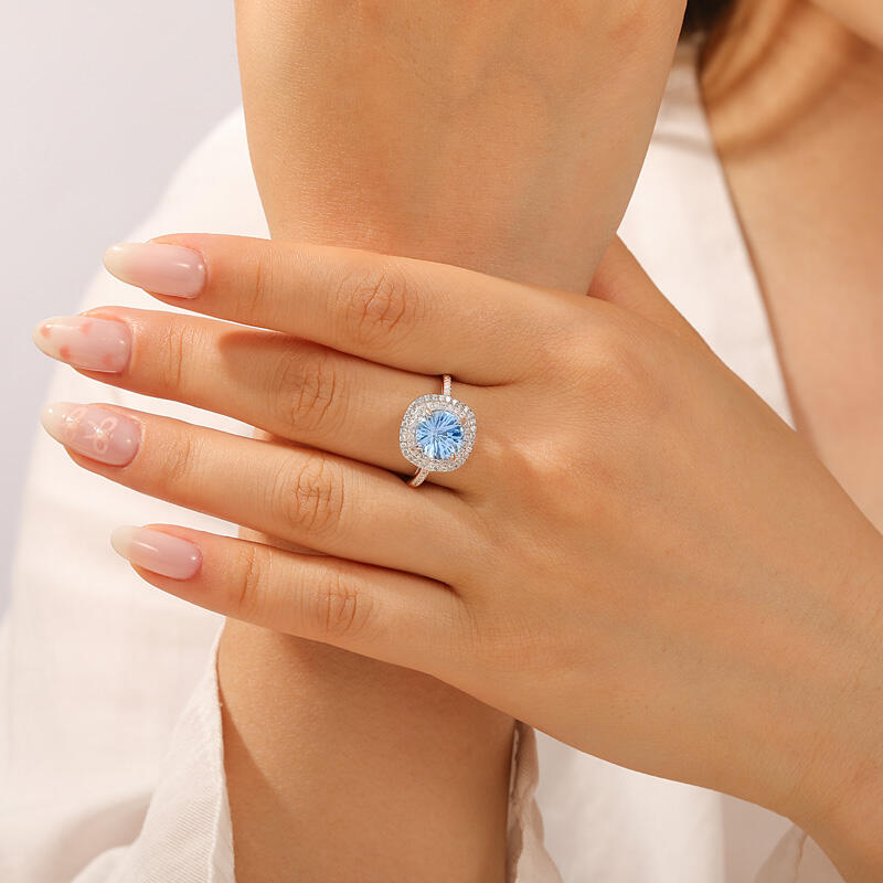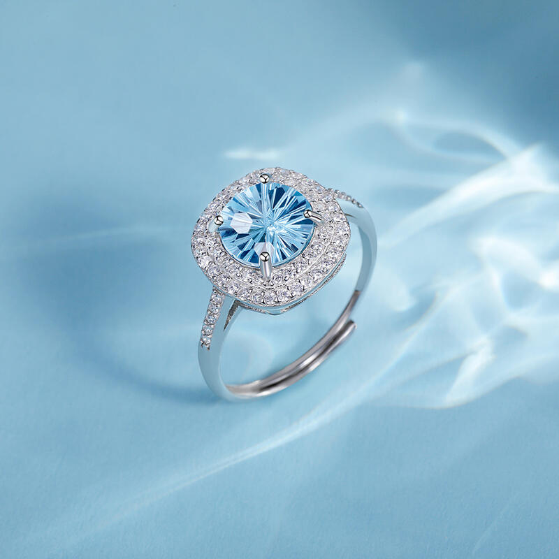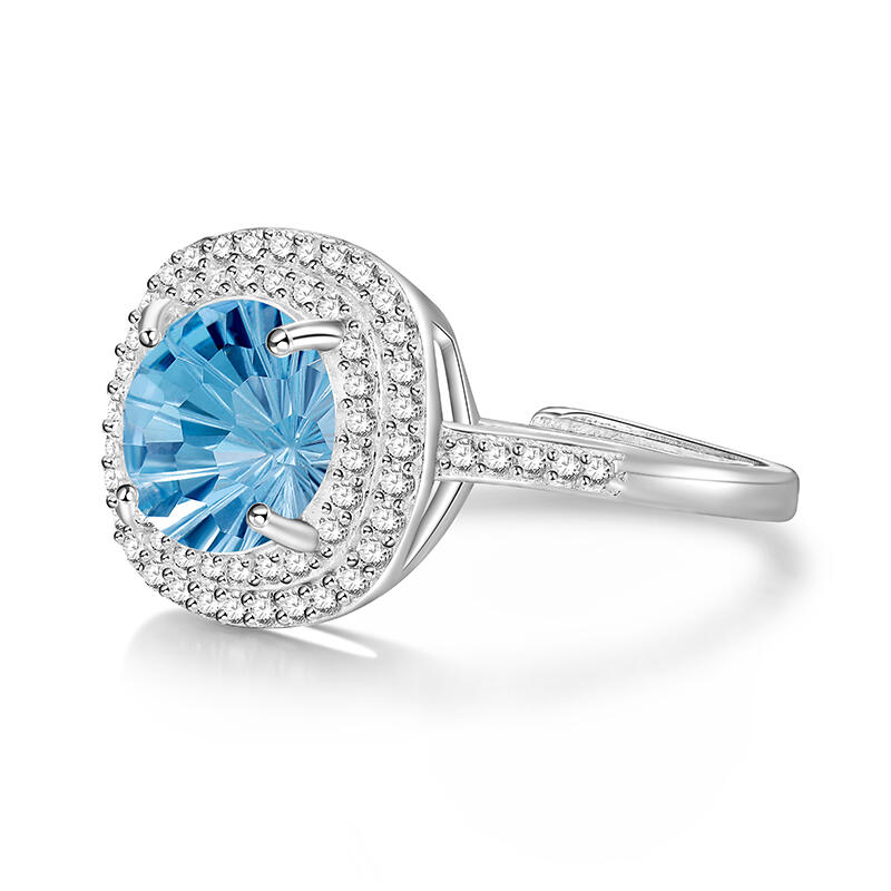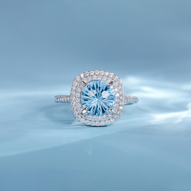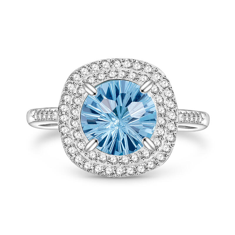 Indulge in the mesmerizing beauty of our double halo engagement ring with round cut topaz. At its heart lies a breathtaking sea-blue topaz, expertly crafted in a round cut that boasts an extraordinary number of facets, creating a dazzling display of light and color. The double halo design not only enhances the overall brilliance of the ring but also adds a touch of lavish sophistication, making the center stone appear larger and more captivating. It's more than just a halo engagement ring; it's a wearable work of art that captures the depth of your love and the brilliance of your future together.