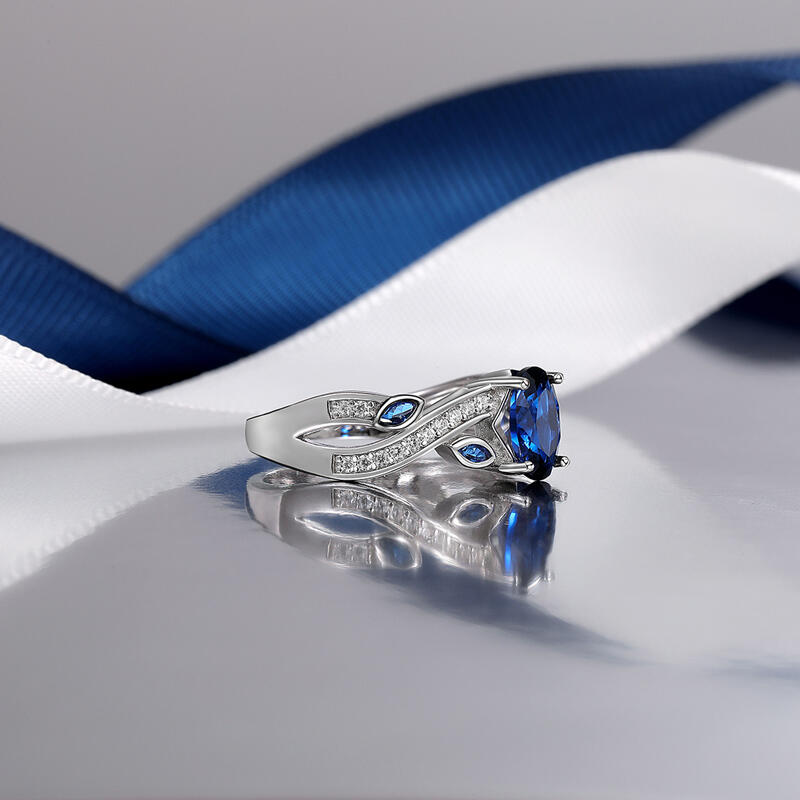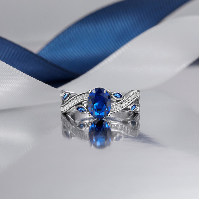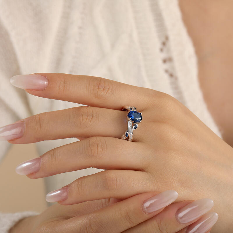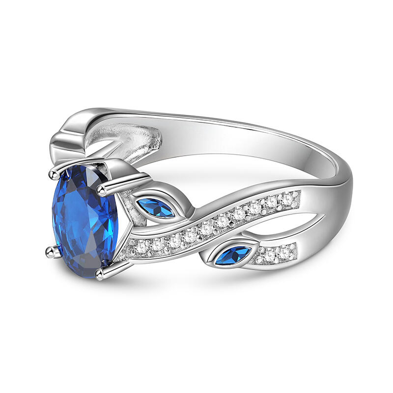 This twist leaves blue sapphire engagement ring combines elegance and natural elements in a unique "twist" design. At the center is an oval deep blue gemstone with an enchanting luster, surrounded by small blue stones and fine diamonds. The band of the blue oval cut engagement ring, with its smooth curves and delicate foliage elements, creates a natural beauty that resembles spring branches swaying in the breeze. The overall design is both modern and artistic, perfect for those looking for unique and personalized jewelry.