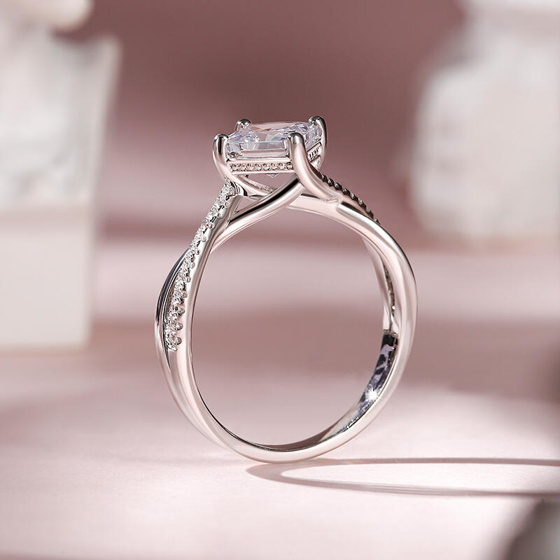 With divine style, this moissanite engagement ring shines with the beauty of your romance. This ring showcases a shimmering princess-cut center stone in a traditional four-prong setting.The polished and shimmering stone-lined ribbons of the shank surround the center in a smart twist design. Luxe and lovely, this engagement ring reflects the unique twists of turns of your romance.