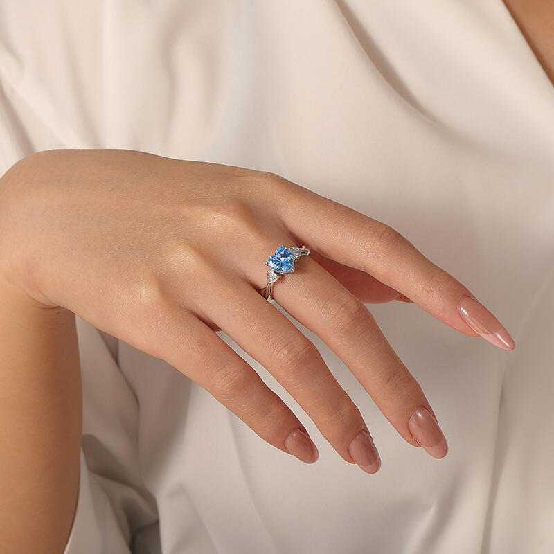 This Jeulia twisted engagement ring features a unique design of three interlocking hearts, symbolizing the depth of love. The center features a dazzling heart-shaped main stone, with two symmetrical heart-shaped designs on either side, each composed of circular stones, creating a touching “heart-to-heart” scene. The ring band features a Twist design, with two strands of silver wire elegantly intertwined like destiny, symbolizing the intertwined lives of lovers while visually extending the lines of the finger. The colors of the stones and metal can be customized to create a truly unique gift.