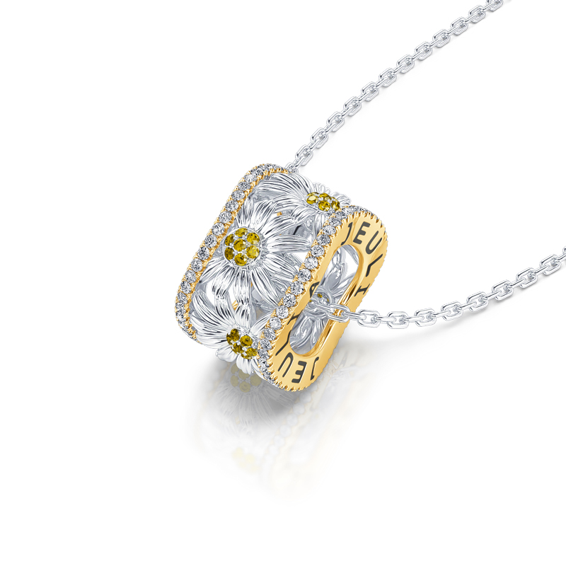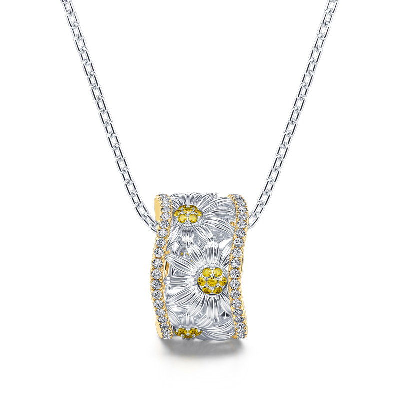 Elegant and beautiul,this flower necklace will capture your heart at first sight! Flower is one of the most popular design elements in jewelry. It's often related with beauty,vitality and happiness, like your love. Crafted in two tone sterling silver, sculptured in six sunflowers in the cut-out shank of the necklace. Every sunflower is set with fancy yellow stones to make the sunflower more lively. Treat yourself a holiday gift with this masterpiece!