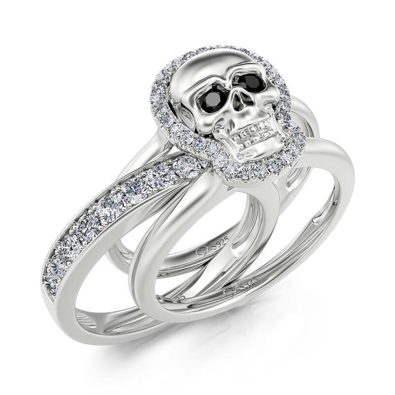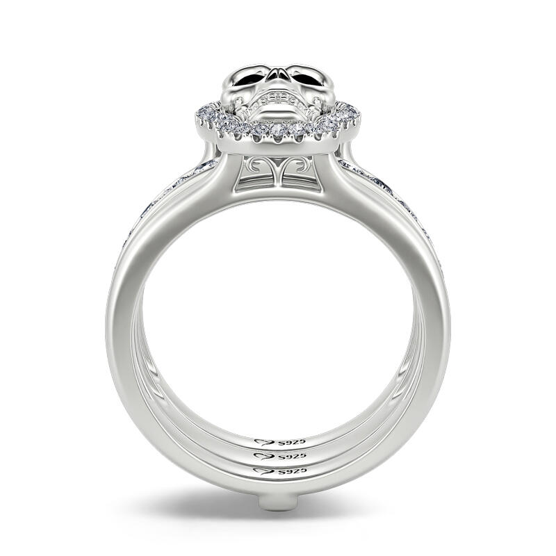 Luxuriously sparkling, this sterling silver ring set features an exquisitely handcrafted skull haloed by a head-shape outline of shining stones. The unique skull ring set is buffed to a brilliant shine and completed with an infinity band in the center. It's a great ring set for wedding, anniversary, birthday, etc. State your promise of love and surprise her with this unmatched ring from Jeulia skull collection.