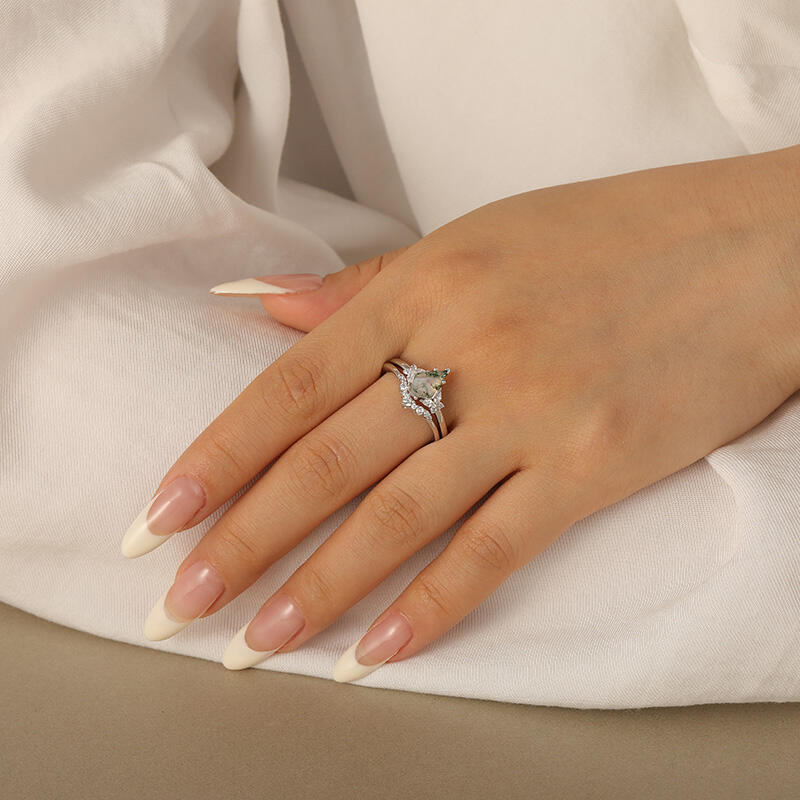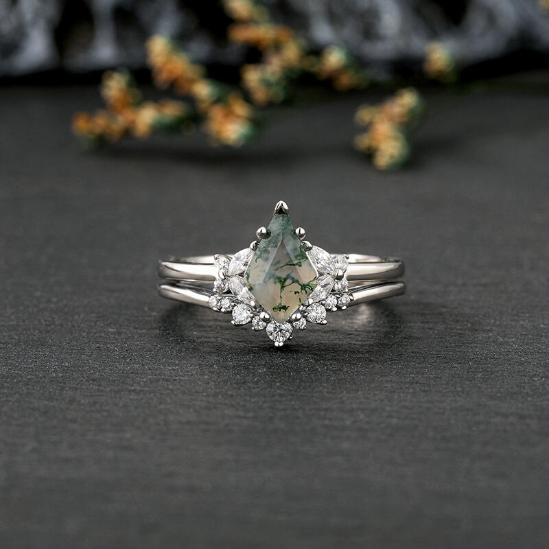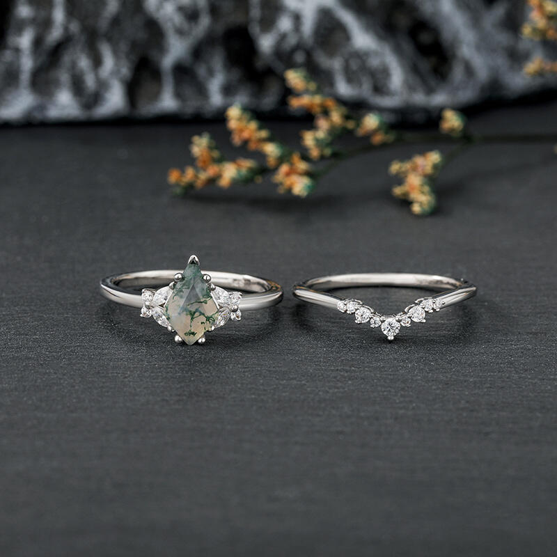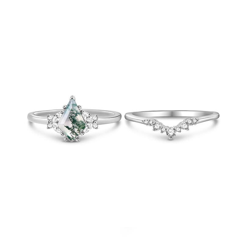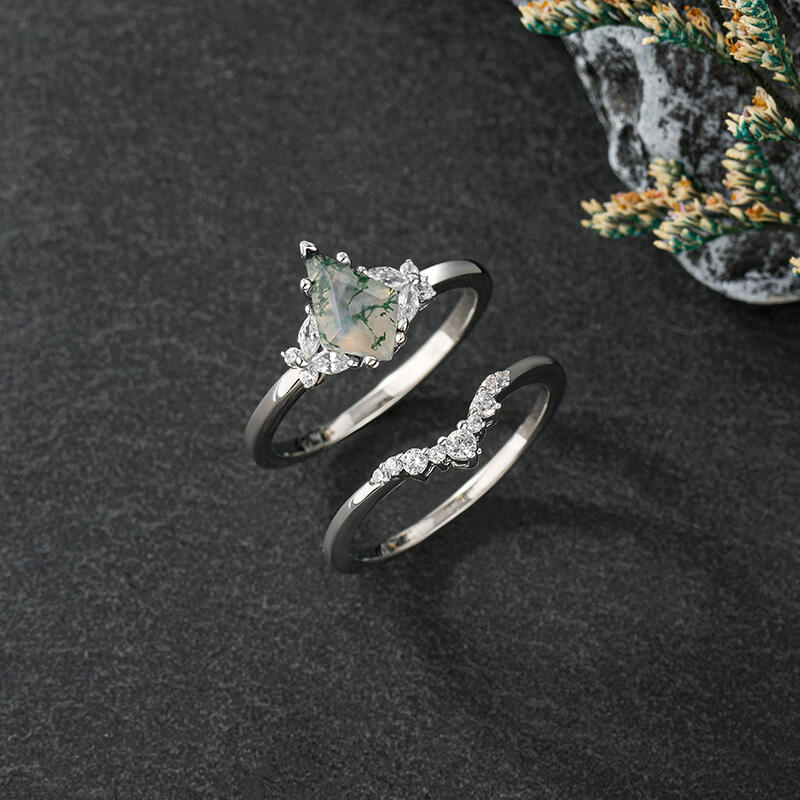 This moss agate engagement ring set combines a kite-cut moss agate main stone and butterfly-shaped side stones in a unique design. The charming moss agate chosen for the main stone displays a unique green color and mysterious texture, giving a sense of tranquility and serenity. The butterfly-shaped side stone adds a touch of playfulness and spirituality, as if the butterfly is dancing among the flowers. The overall design is simple and stylish, full of modern flavor, showing a unique flavor and taste. Wearing this unique kite-cut engagement ring set not only shows elegant temperament, but also conveys self-confidence and independent attitude, which is the perfect choice to show your individuality and charm.