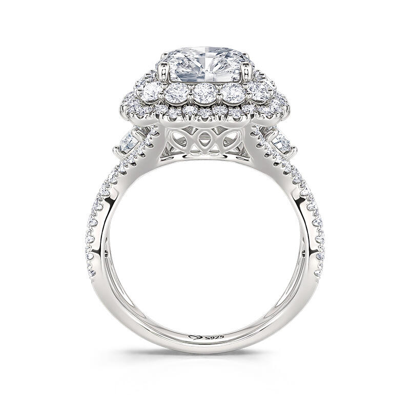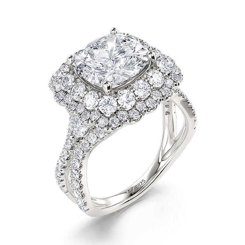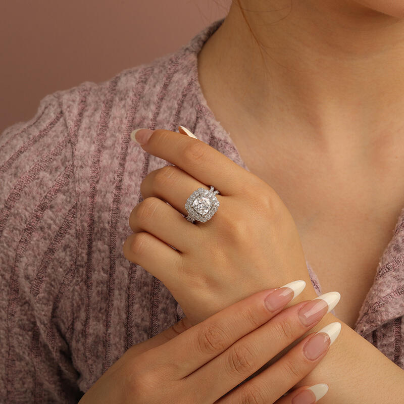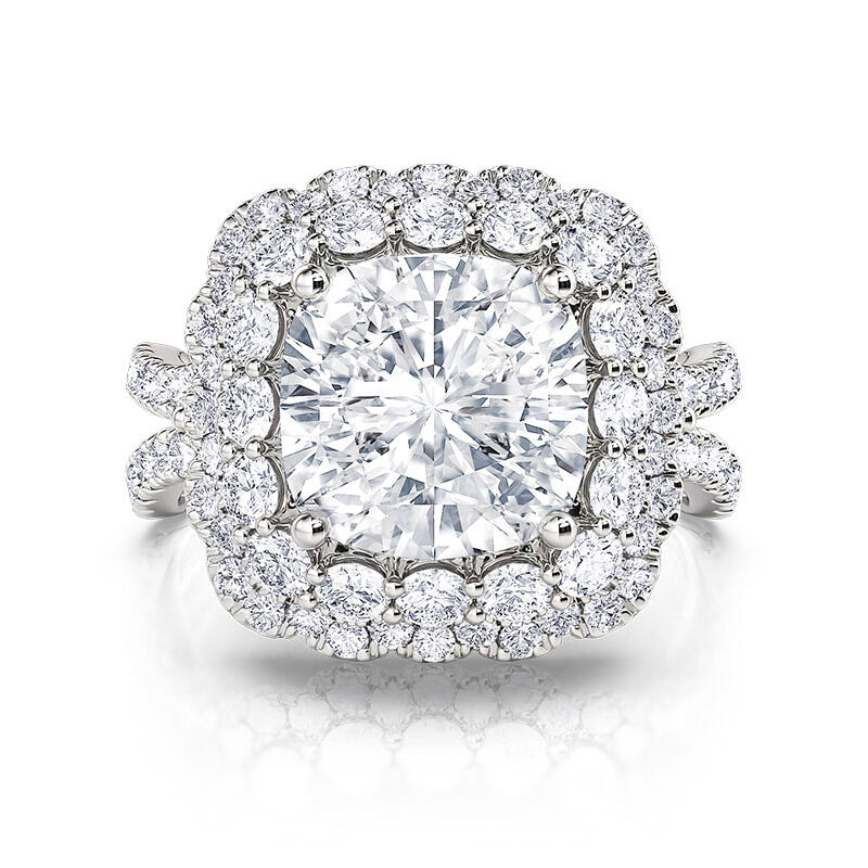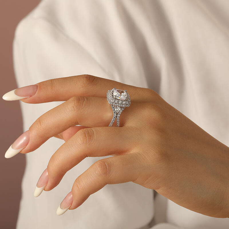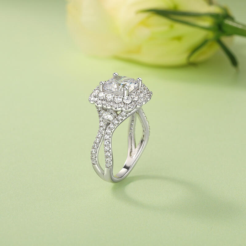 This romantic twist floral halo engagement ring boasts a stunning cushion-shaped main stone with a brilliant flower halo that seems to reflect the light of the main stone, emitting a dazzling glow. The floral halo engagement ring's arms are uniquely designed, featuring a twist texture symbolizing the intertwining of life's experiences and emotions. This vintage engagement ring is not merely an expression of love,it is also a cherished emotional support, embodying a profound sense of affection and promising a bright future. Wear this flower engagement ring and let love flourish in every intricate detail.