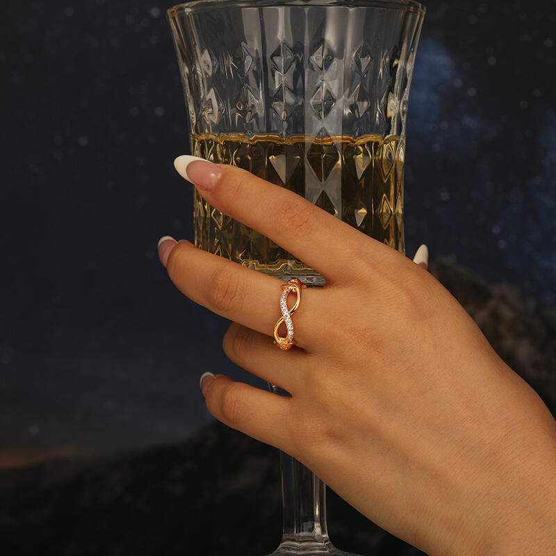 The arm of this vintage gold vine infinity ring with sterling silver features a vine-maned twist that subtly presents the infinity symbol, symbolizing eternity and endless love. Not only is it poetic, but it also highlights the expectation of a lasting relationship. The gold vine ring band is also set with a row of sparkling round stones, combining simplicity with luxury. Embodying a fusion of nature and art, this vintage gold vine infinity band is a modern take on a classic element, conveying a gorgeous beauty that is simple and uncomplicated.