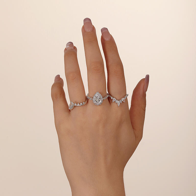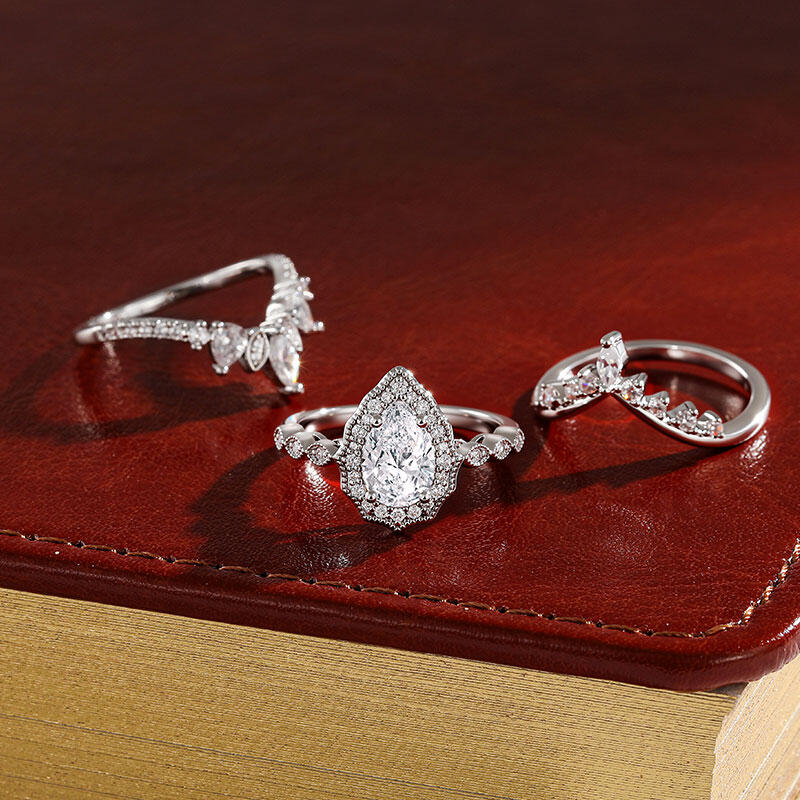 This Jeulia vintage pear-cut wedding ring set recreates the opulent charm of Victorian jewelry through its inlaid design. The main ring features a pear-cut center stone that maximizes the gem's teardrop silhouette; The enhancer band, crown-shaped and adorned with graduated vintage-cut stones, interlocks with the main ring to form a complete crown silhouette. This vintage engagement ring set complements lace wedding gowns in classical ceremonies while offering versatile styling for everyday wear. The dialogue between crown and teardrop transforms love into an eternal coronation.