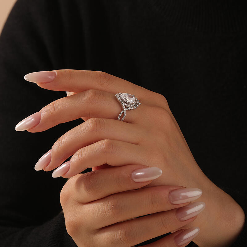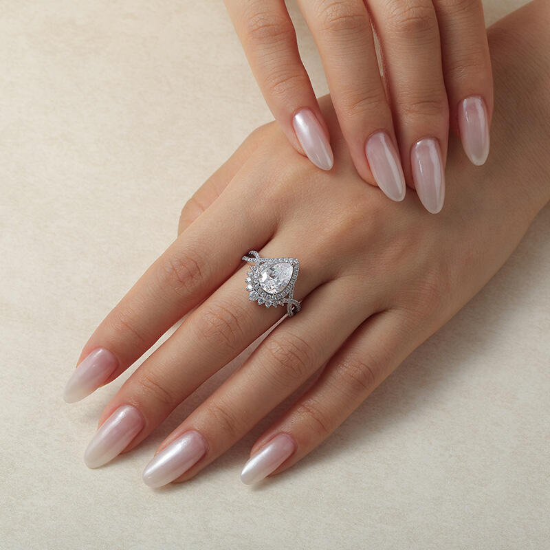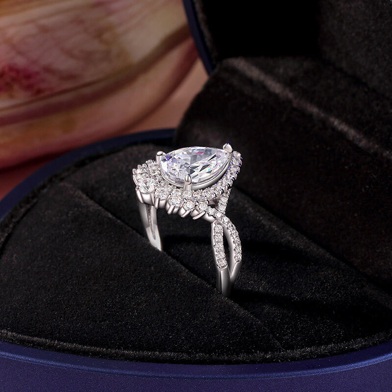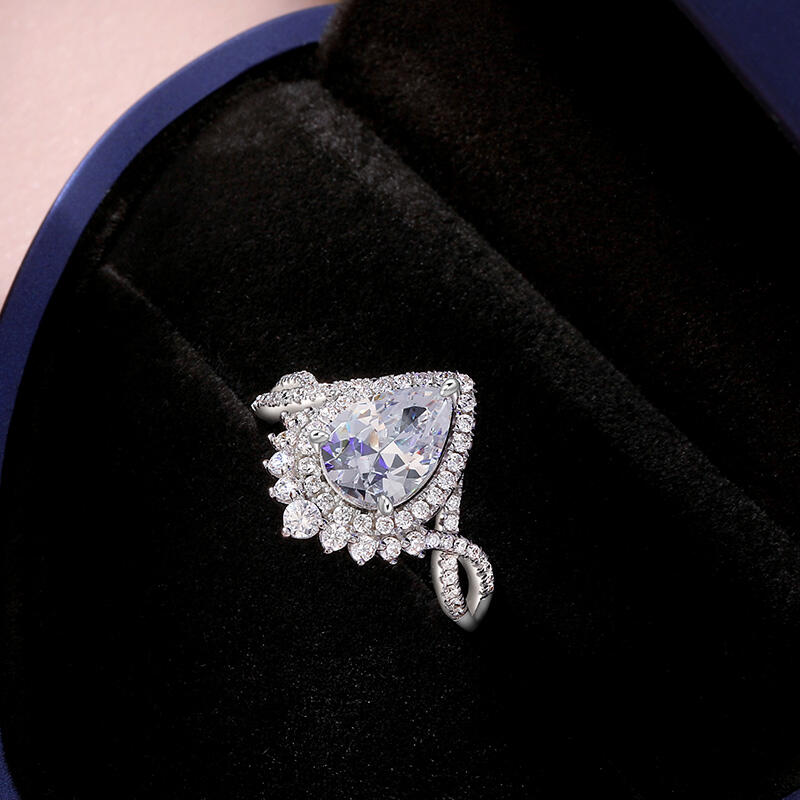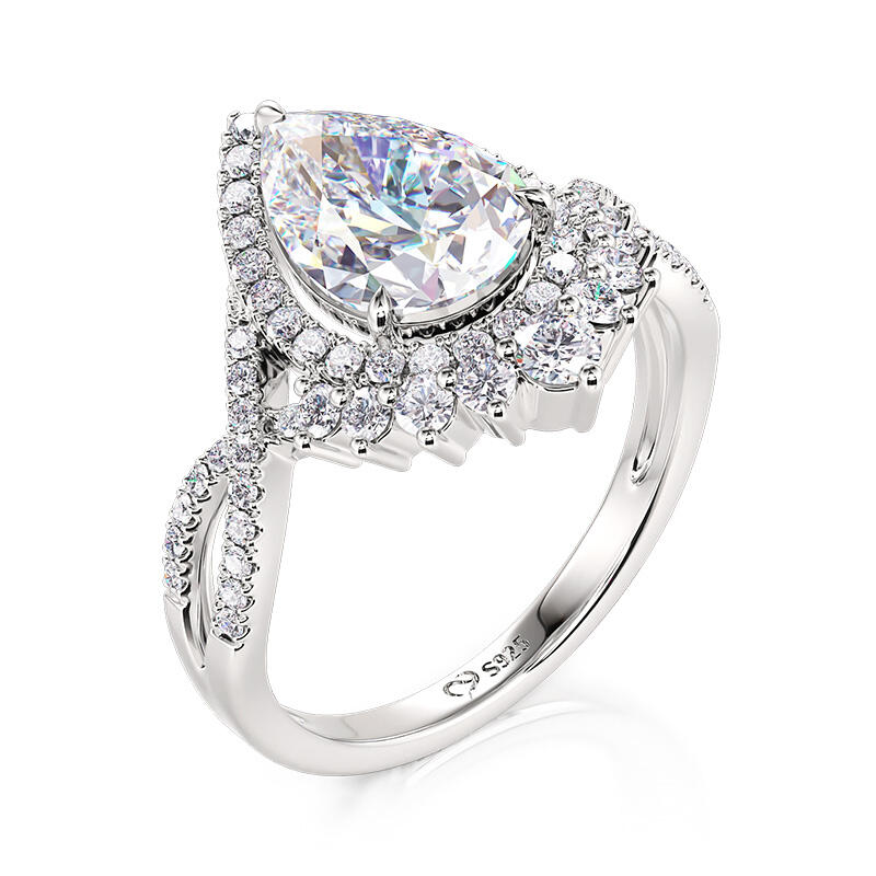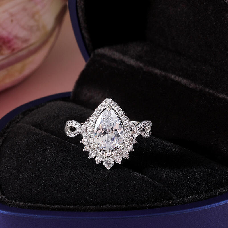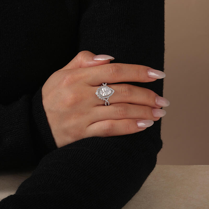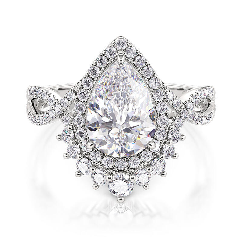 This stunning halo pear-cut engagement ring is a captivating blend of unique design and exceptional craftsmanship. The pear-shaped main stone is dazzling, intricately cut to reflect light from different angles, while the halo design enhances the vintage twist engagement ring's overall beauty, showcasing your love and unwavering commitment. The gracefully curved gradient halo at the bottom subtly creates the illusion of a stacked ring, adding to the overall elegance and sophistication of the design. This vintage halo pear-cut engagement ring is not just a symbol of love, but also a testament to a cherished commitment that will endure forever.