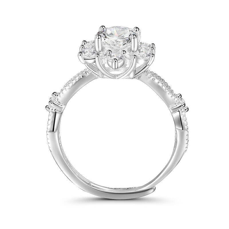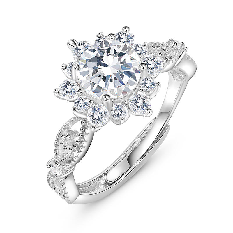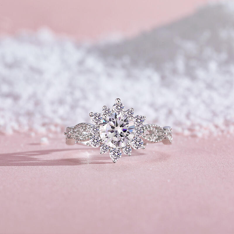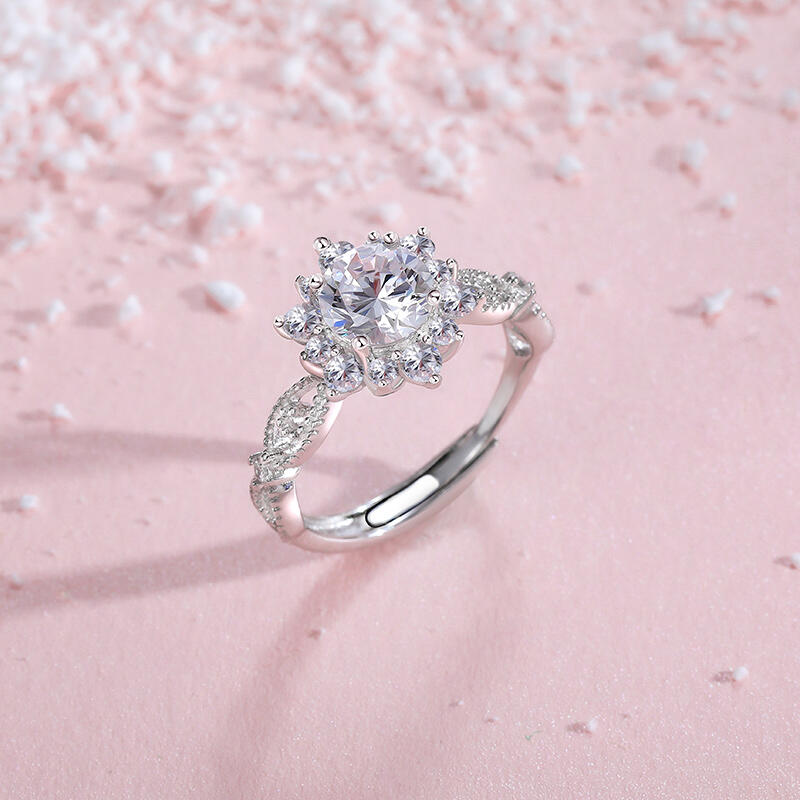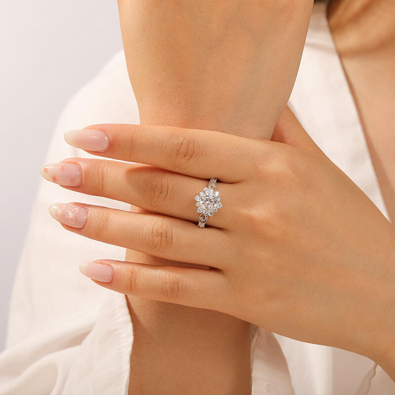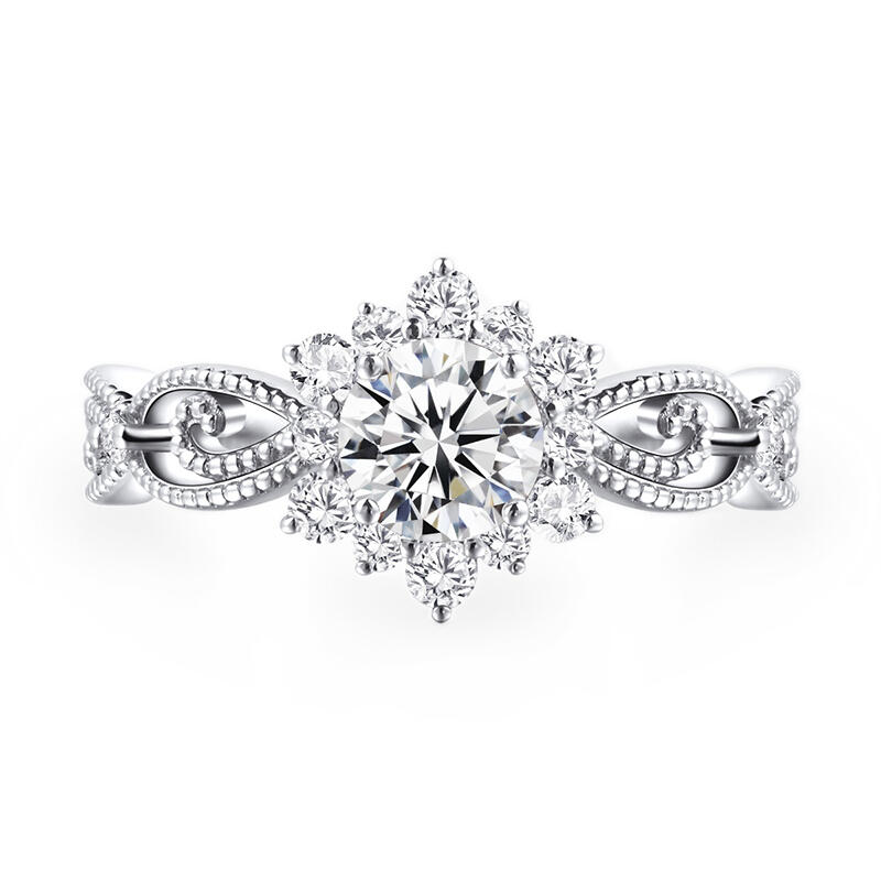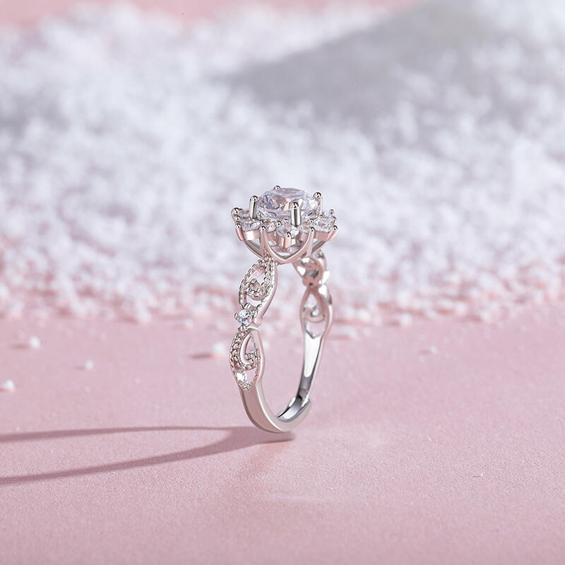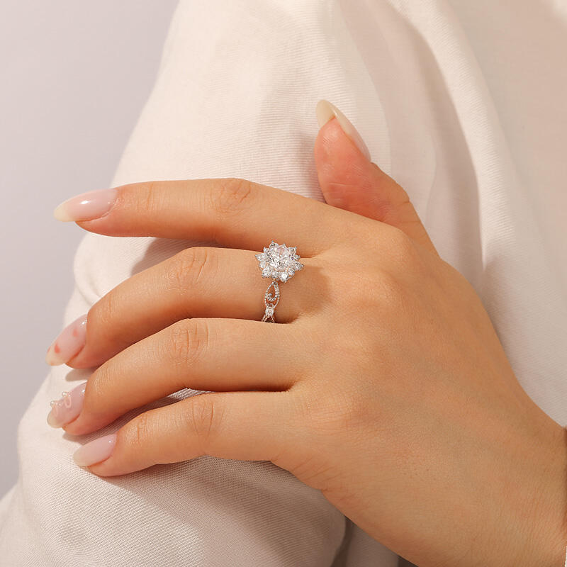 Embrace the enchanting allure of winter with our vintage halo snow ring. At its heart, a dazzling center stone is encircled by a delicate six-petaled snowflake halo, meticulously crafted from sparkling smaller stones, representing the dual blessings of happiness and good fortune. The vintage halo ring's open design features an intricately patterned band adorned with exquisite milgrain detailing, evoking a rich, vintage aesthetic that speaks to the romantic soul. Whether worn as a promise ring, an engagement ring, or simply as a statement piece, this vintage snow ring will sure to add a touch of frost-kissed magic to your everyday ensemble.