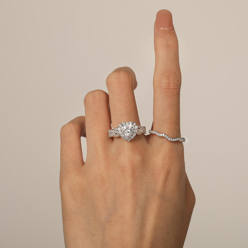 This Jeulia vintage halo heart-cut bridal ring set seamlessly blends retro and romantic elements. The main ring features a heart-shaped center stone surrounded by a dazzling halo design, paired with the iconic Twist band, exuding elegance and dynamism. The heart-shaped center stone is crafted using an improved cutting technique, enhancing its fire and brilliance. The pave-set diamond halo is precisely arranged to visually amplify the effect of the center stone. The secondary ring features a sleek Twist band design with smooth, flowing lines, allowing it to be worn alone for a subtle, understated elegance or stacked with the main ring to add depth and dimension. This vintage bridal ring set design preserves the ceremonial essence of a classic wedding ring while incorporating modern, fashion-forward elements through its twisted motifs.