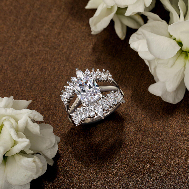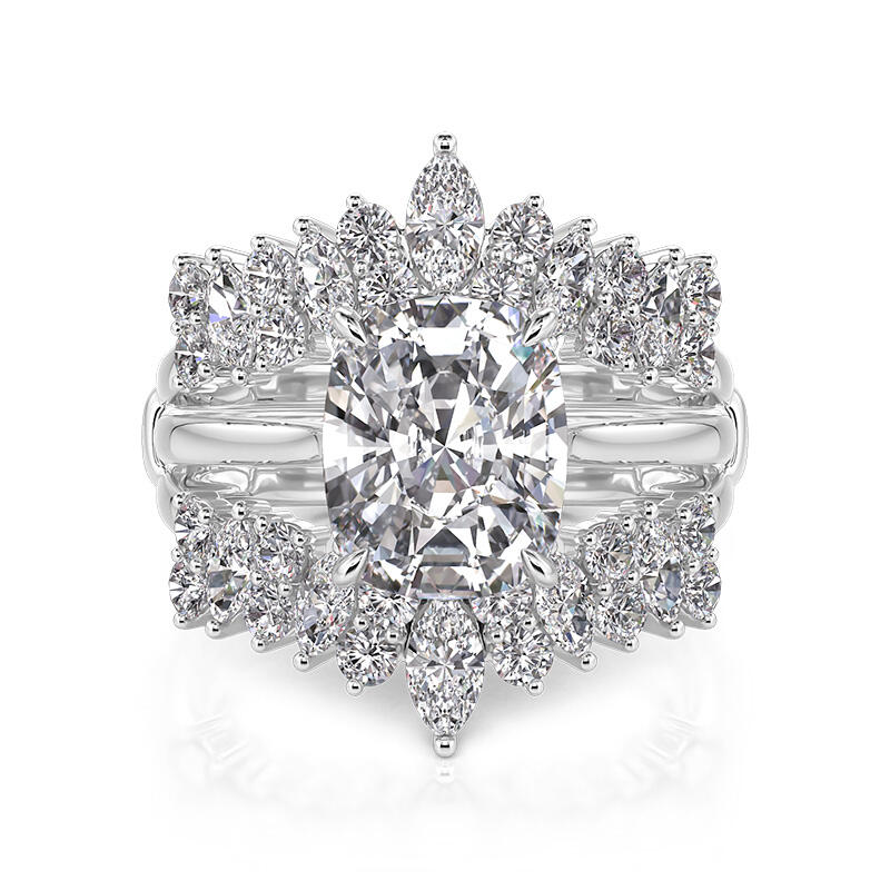 A perfect fusion of vintage inspiration and contemporary jewelry craftsmanship, this interchangeable bridal ring set features a cushion-cut center stone as its focal point, delivering exceptional brilliance. The center stone is meticulously cut to maximize light performance, showcasing a mesmerizing play of fire and brilliance with its high transparency.