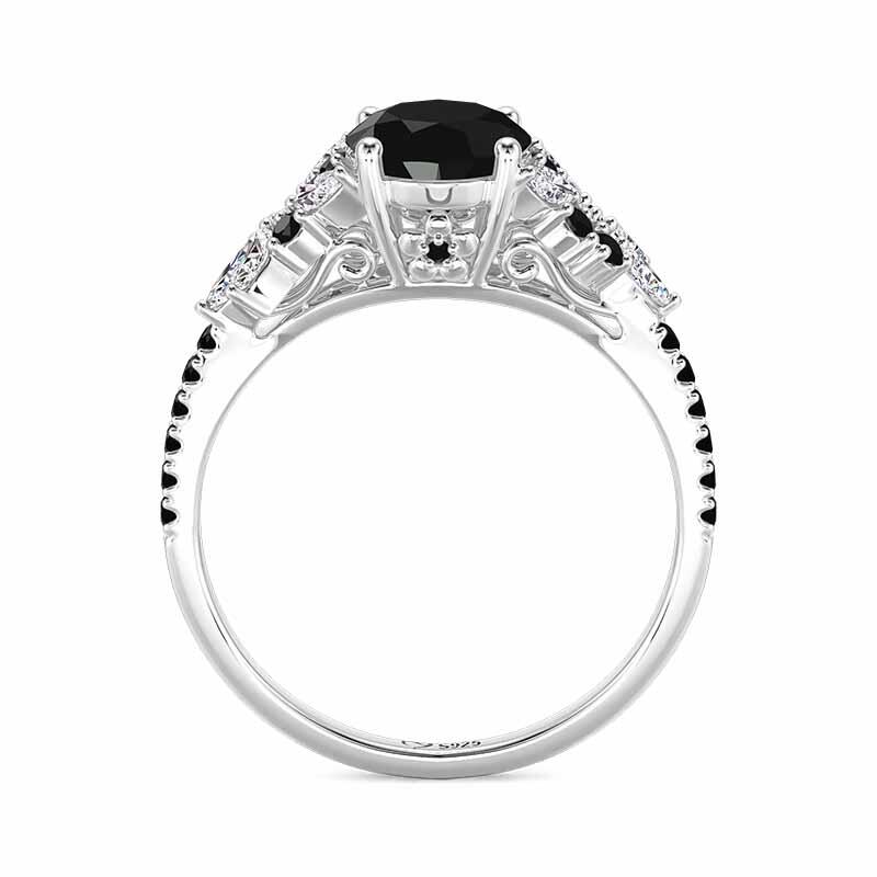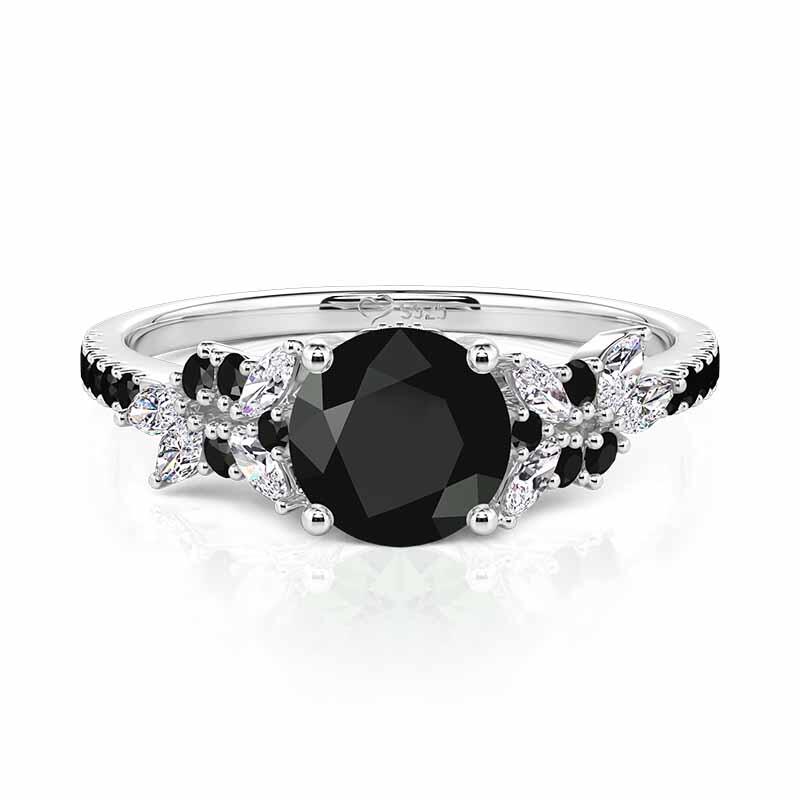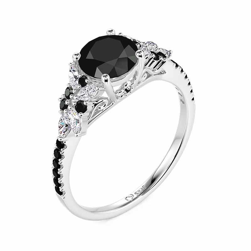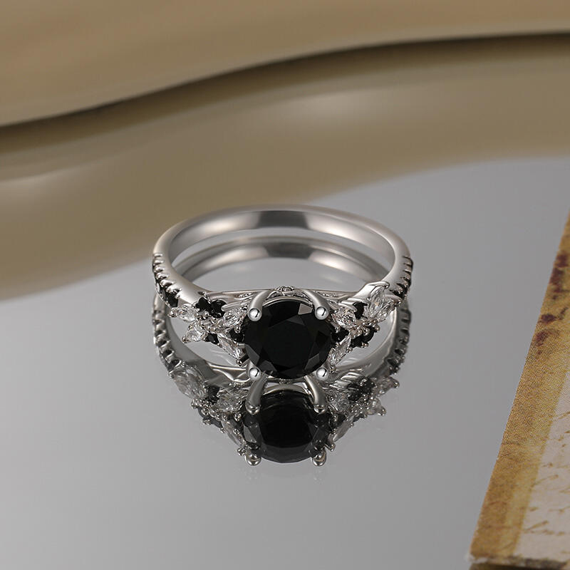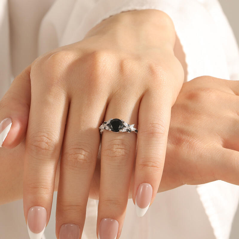 In the stillness of the night, the vintage midnight black butterfly engagement ring dances like a butterfly's shadow, uniting mystery and elegance on the finger. In the center is a deep black round main stone, like the brightest star in the night sky, symbolizing the eternity and depth of love. On the arm of the black engagement ring, three white marquise stones and three small black round stones are skillfully arranged to outline a pair of agile butterfly wings, clustered around the main stone, as if dancing in the quiet midnight. The small black stones pavé-set on the band are like stars, adding a touch of understated luxury to the overall design. Inspired by butterflies, this black butterfly engagement ring incorporates spirituality and elegance into its design, symbolizing the beauty and transformation of love. Whether it is a romantic engagement ceremony or a precious moment of remembrance, this vintage engagement ring will be a unique witness to the eternal promise of your loved one.