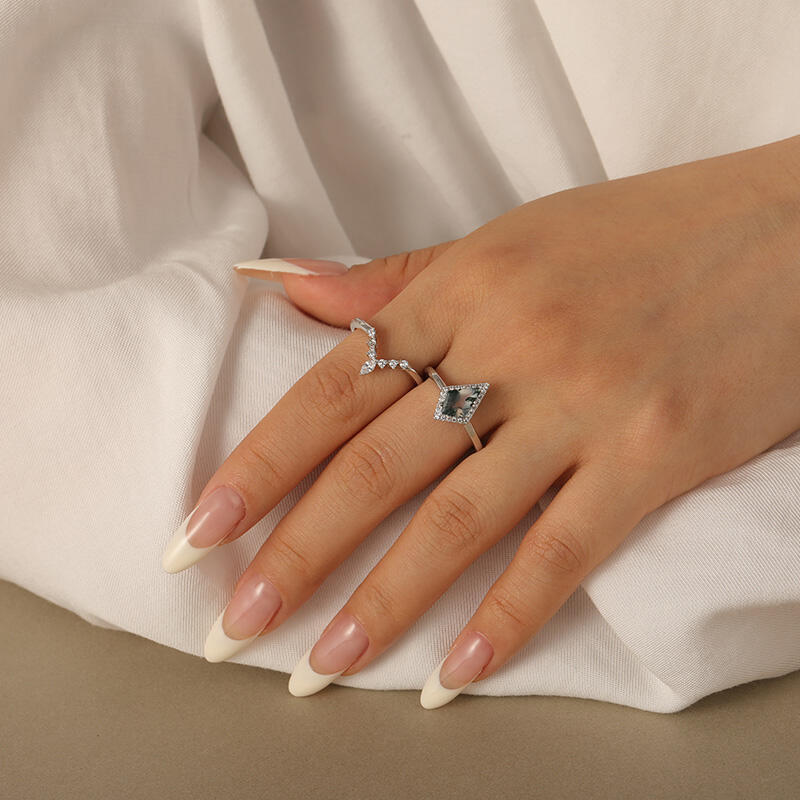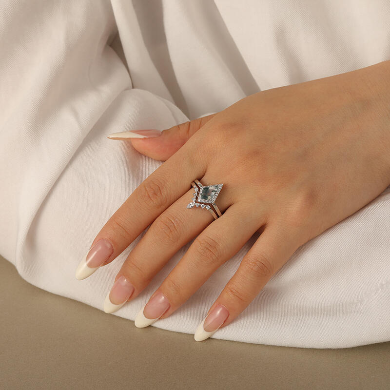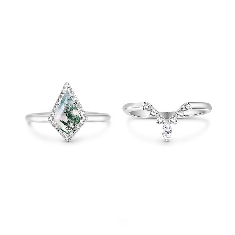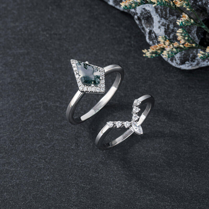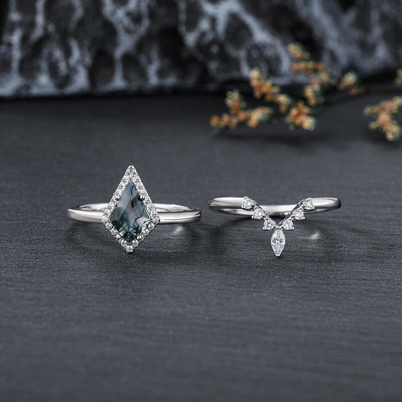This vintage moss agate engagement ring set catches the eye with its unique silhouette and exquisite design. The main stone takes on the unique shape of a kite and shimmers with enchanting light, with the center stone transmitting a light color, like a gemstone in a secret world. Surrounded by sparkling diamonds, it forms a magnificent halo, adding a sense of unparalleled luxury. The meticulous craftsmanship of the vintage ring allows it to shine in the sunlight, making it suitable for a variety of occasions, ideal for showing off your taste and style, whether it's for a formal party or an everyday ensemble.