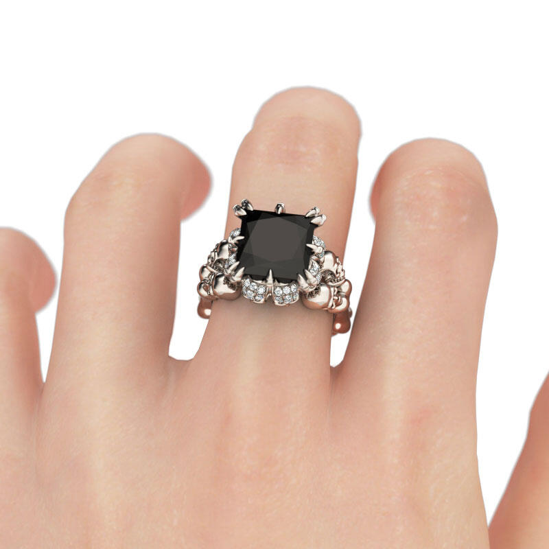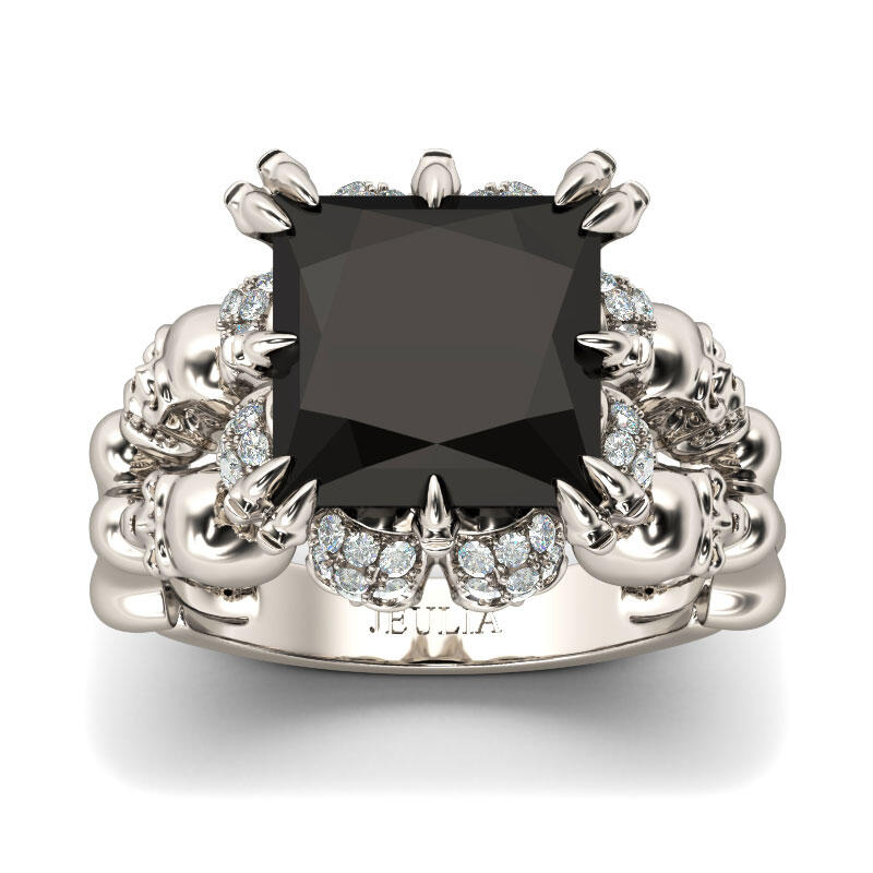 Inspired from Halloween, this cool skull ring features its four skulls on the band. They will show a unique look on your finger. The hidden skulls under the mount will shine brilliantly with every movement of your finger. Moreover, the ring is set with a 9mm princess-cut black Jeulia® Stone, which makes the ring a stylish piece this year. Black gemstone is in trend in 2018-2019. Never miss this masterpiece!