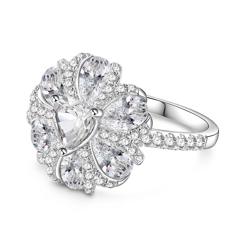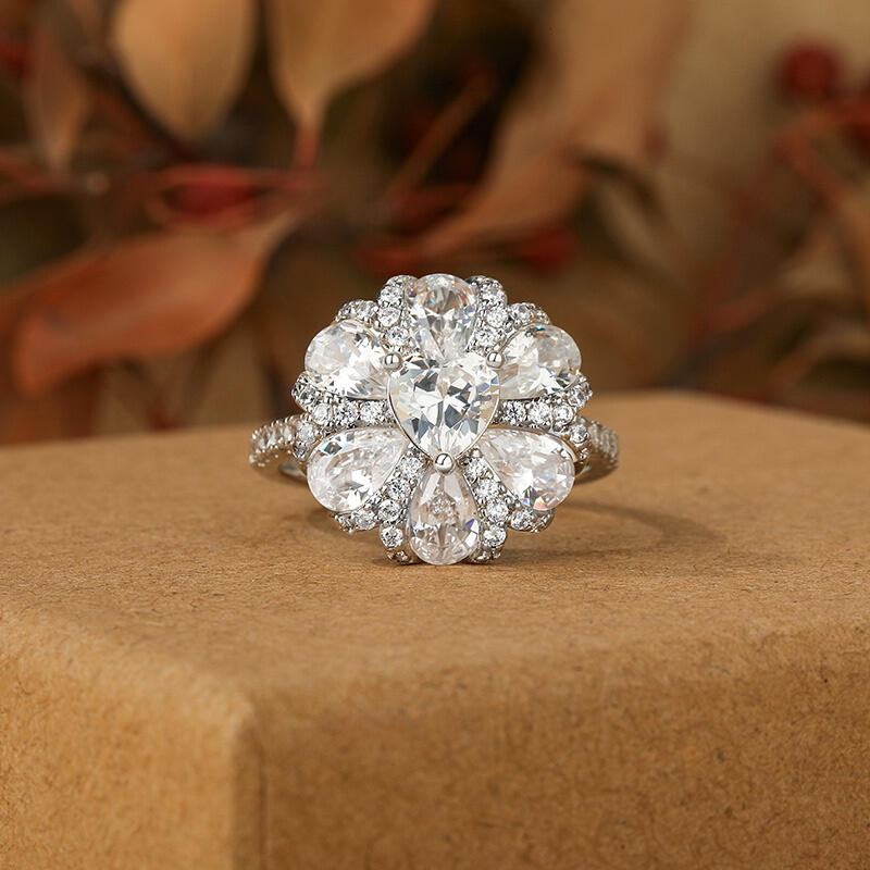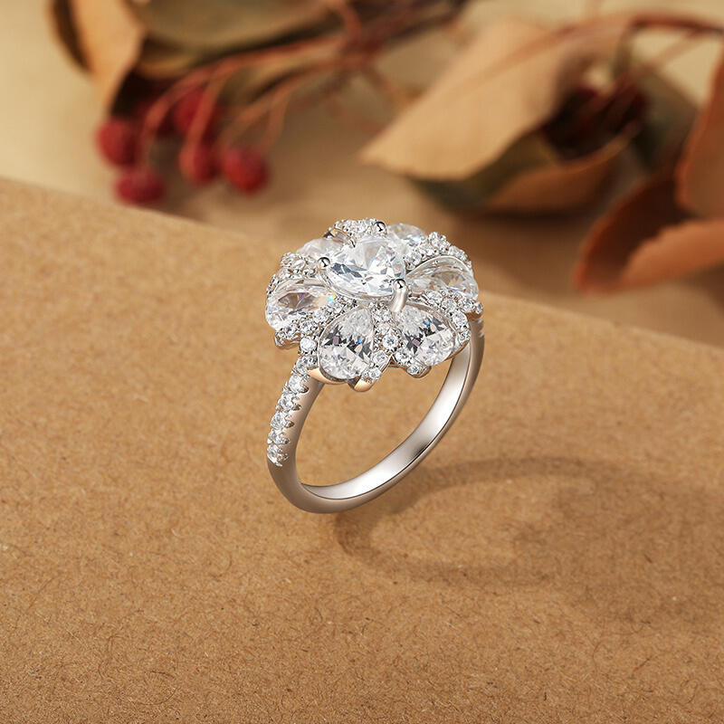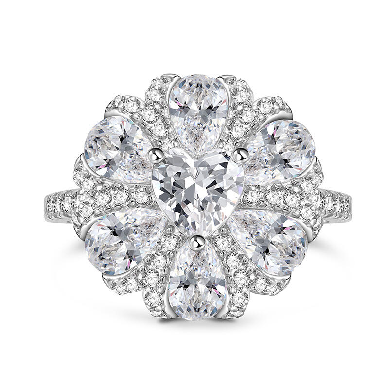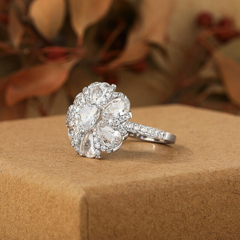 Love is like water, delicate and clear, as in this engagement ring with teardrop stones enclosed in petal shapes. The heart-shaped main stone in the center glows in the radiant light, symbolizing two hearts clinging to each other. The sterling silver texture represents pure and sincere love, making this promise last forever. By choosing this flower engagement ring, you are choosing to perform a romantic and eternal love legend with the one you love. May it witness your love last forever.