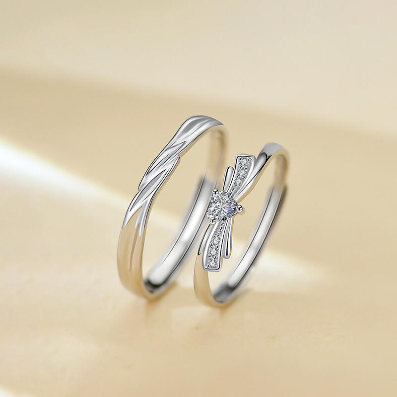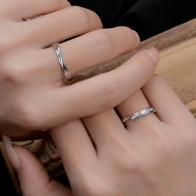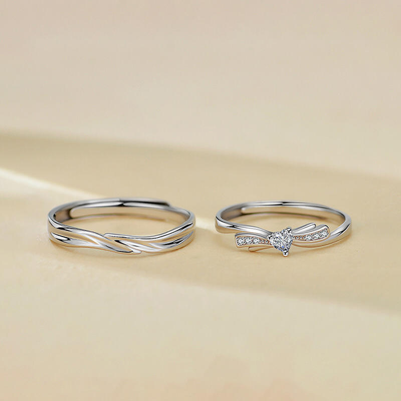 Introducing our exquisite adjustable couple ring set, a perfect union of two beautiful wedding bands designed to celebrate your shared journey. The men's wedding ring features a striking wave line design, with smooth sliver surface and no stones, highlighting the intricate craftsmanship and timeless elegance. The wave lines symbolize the ups and downs of life, while the polished finish adds a touch of sophistication. The women's wedding band complements it perfectly with its delicate knot heart cut design, featuring a small heart cut stone at the center. Together, these rings form a harmonious and stylish couple ring set, representing your united bond and commitment.
