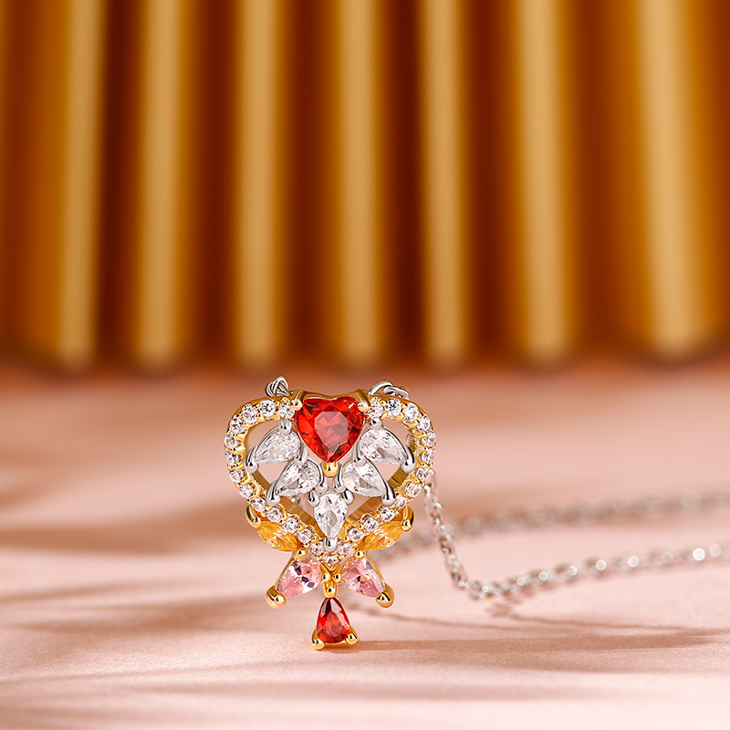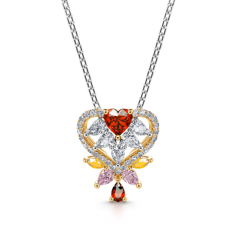 This piece move the love along to the commitment stage with a representation of love in varying heart-shaped motifs. Crafted in sterling silver, a heart frame is decorated by white, red,yellow and pink stones, which symbolize “forever.” Spread some love with this heart-shaped necklace.
