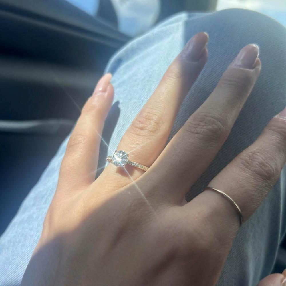 Timeless and elegant, this engagement ring is a classic look she'll adore. The eye is drawn to the round cut center stone in a traditional four-prong setting. With additional small stones on the shank, the ring sparkles crazily from every angle. Designed to take her breath away and record your love, the ring is the best choice to propose to her.