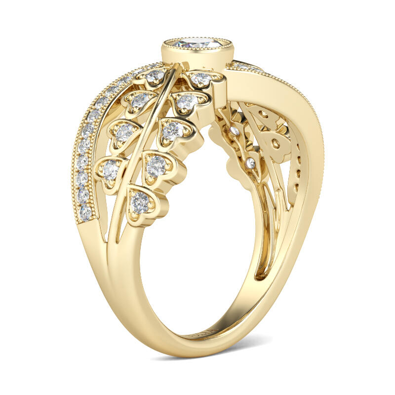 Dainty and delicate, this ring will capture your heart with its unique design. Crafted in gold tone sterling silver, the ring features its infinity shank. And the shank is sculptured with little hearts with shimmering stones set on it. A bigger round-cut stone is set at the center to complement the brilliance. Infinity is one of the most popular motifs in jewelry, which is related with eternal love.